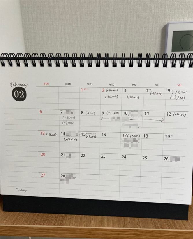 보통 다른 달력은 네모 칸만 있는데 이거는 줄로 나뉘어져있어서 여러내용을 한번에 정리하기도 좋고 윗칸은 돈쓰는칸으로 통일하고 두번째줄은 일정적는걸로 쓰는 란을 나눌 수 있어서 사용하기 좋은 것 같아요 👍