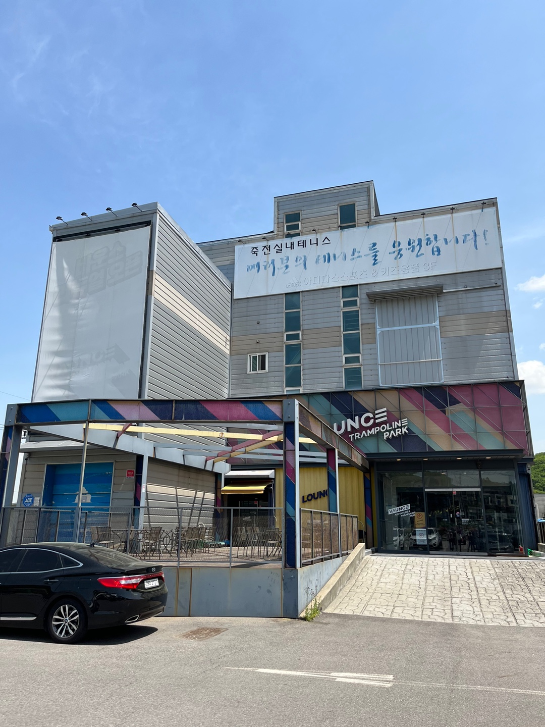 넓은 주차장과 그 안쪽에보이는건물! 바운스트램펄린파크 죽전점이에요 ㅎㅎ