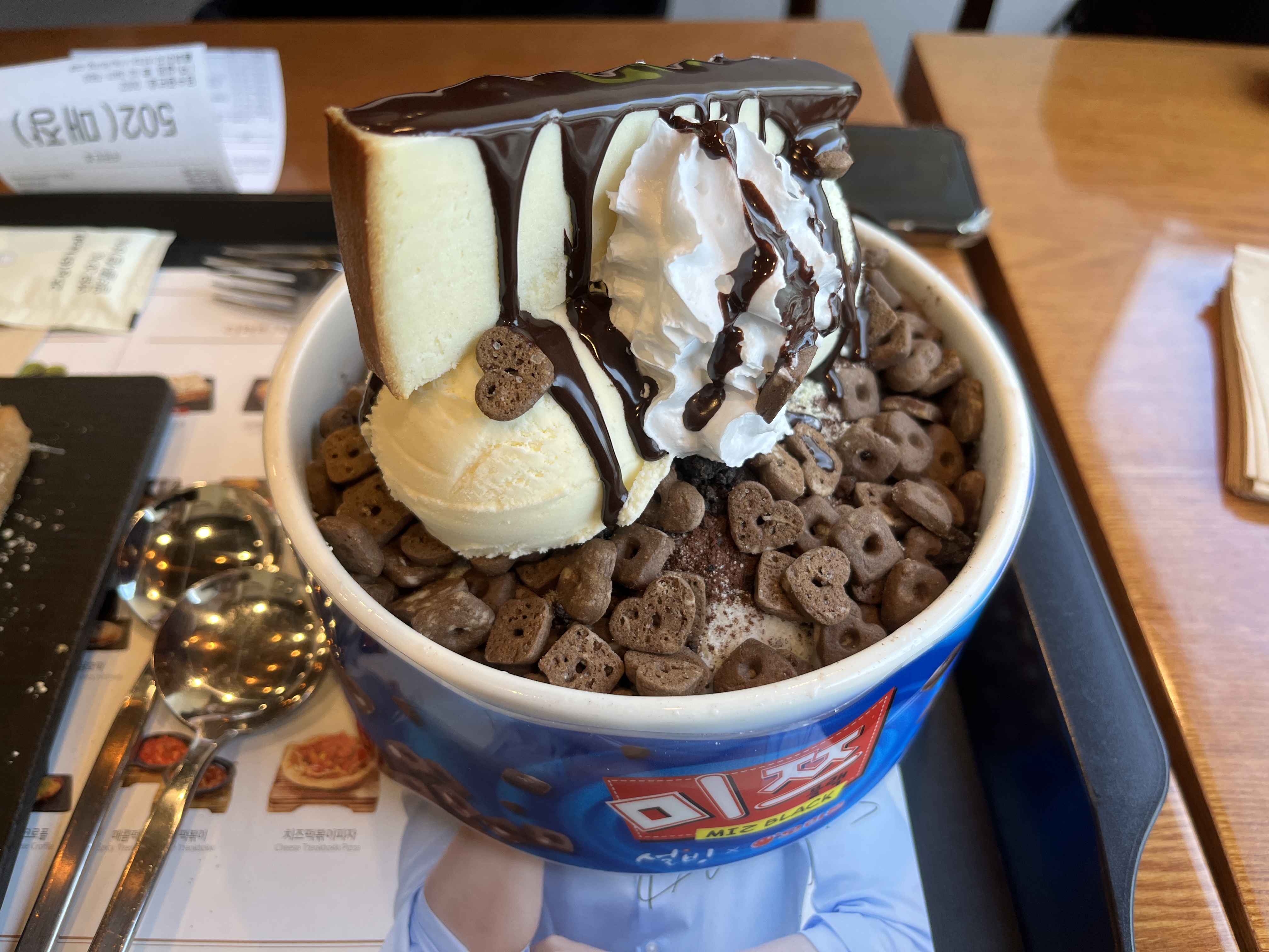 위에 바닐라아이스크림이랑 생크림 위에 또 치즈케이크 한조각이 얹어져있어요 ㅎㅎ