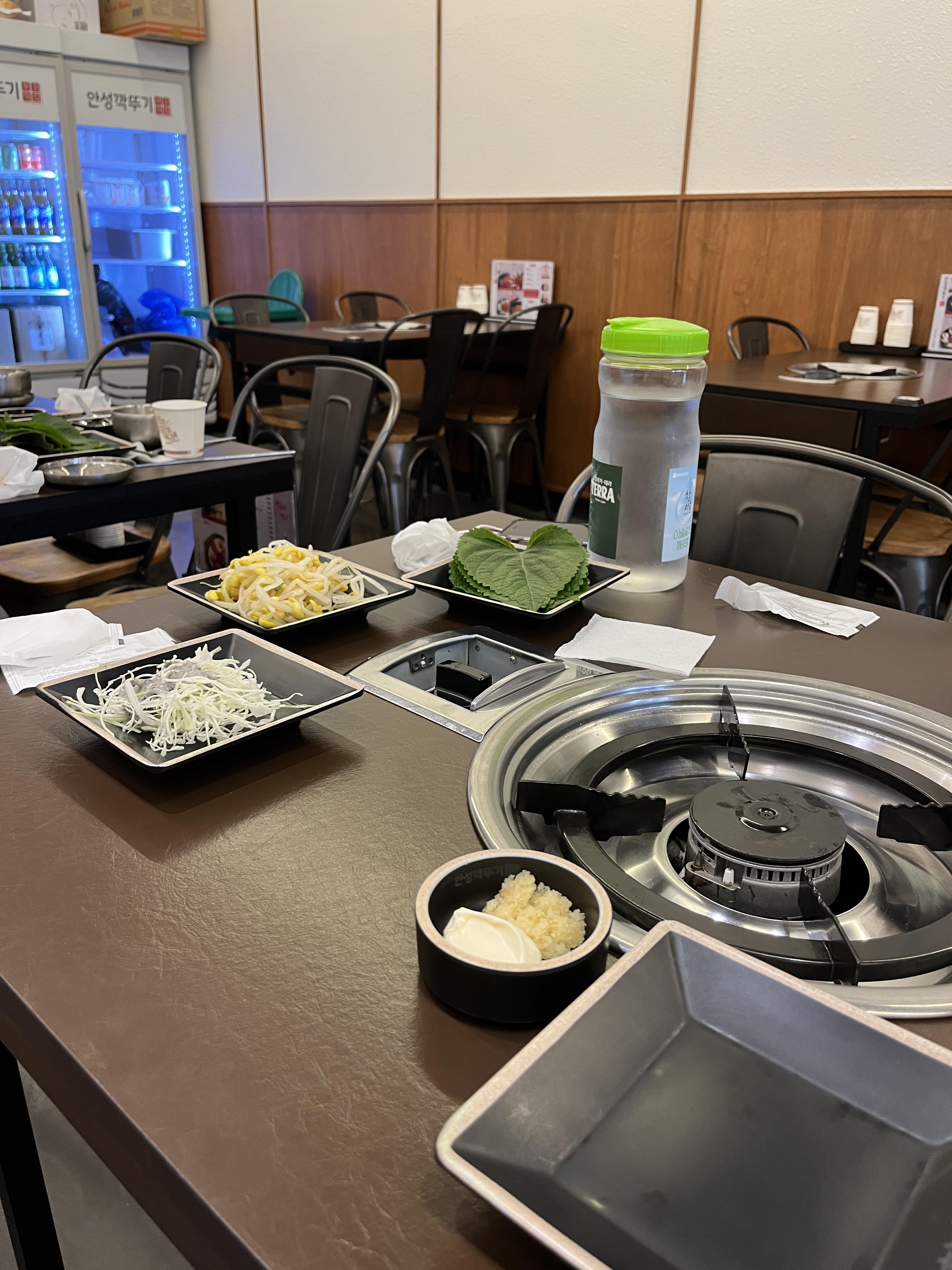 기본세팅은 이렇게 샐러드,콩나물,깻잎 그리고 소스에요.