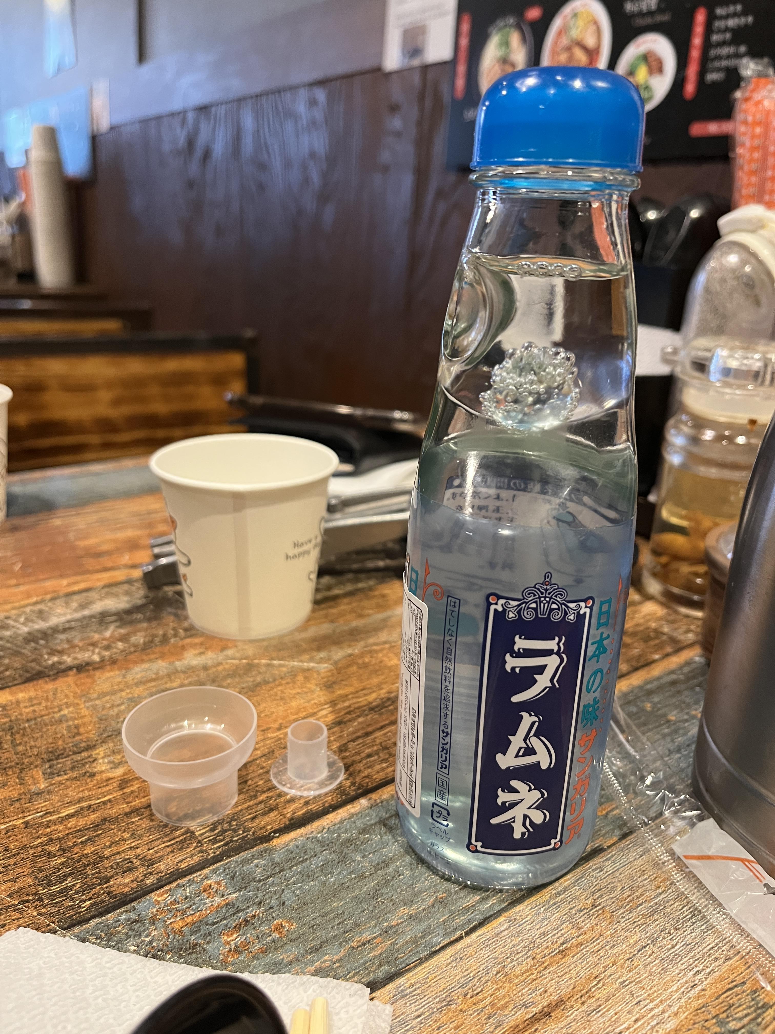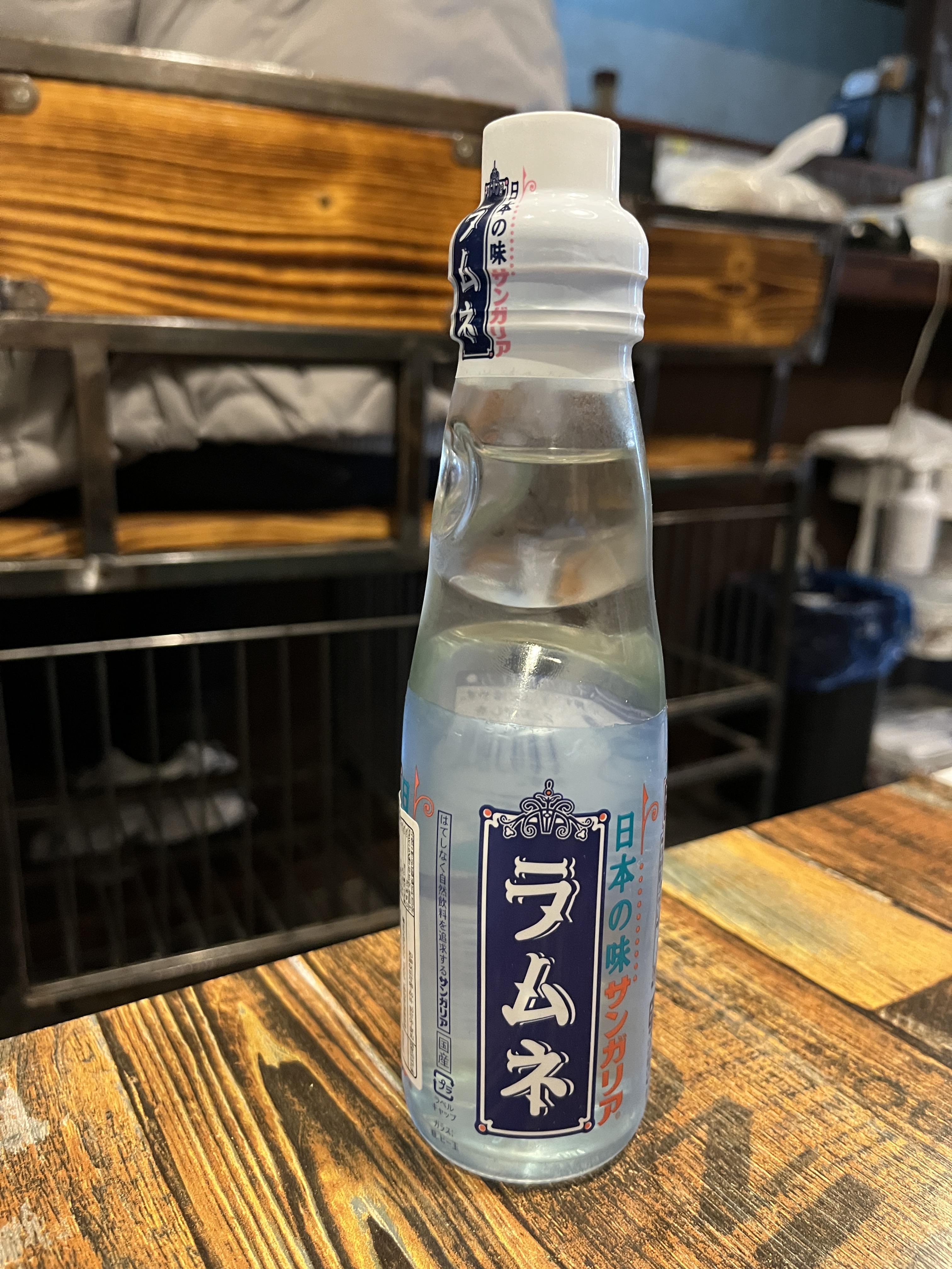 두가지 메뉴의 조합이 좀 느끼해서 음료를 주문해봤는데, 이름이 라무네 (일본에서 소다 사이다로 유명한 음료수) 더라구용. 나왔을때 열면 저렇게 왼쪽 아래 사진처럼 두개의 뚜껑부분이 보이는데, 두번째 주둥이로 뚜껑쪽을 꾸욱 세게 눌러서 원형의 구가 음료안으로 들어가야 먹을 수 있더라구요!