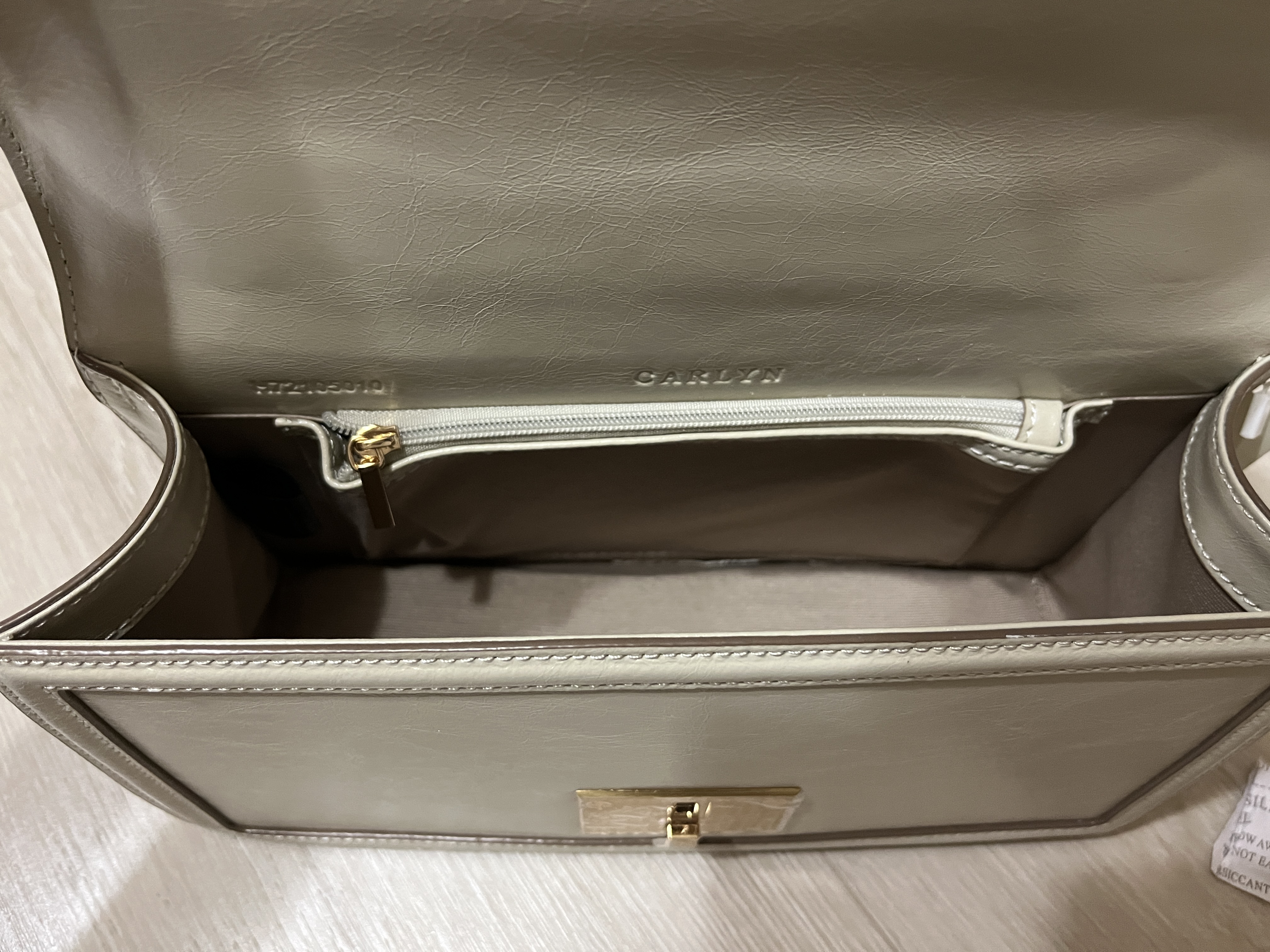 열었을 때는 큰 구역하나랑 안에 지퍼로 된 작은 부분, 앞쪽에 포켓부분 하나 이렇게 세부분으로 나뉘어 있어요. 가방이 꽤 탄탄하고 흐물하지않게 모양이 잡혀있어서 크기보다 더 많이 쑤셔넣기는 무리가 있더라구요! 크기보다는 생각보다 덜 들어가긴한데 작은 파우치, 쿠션, 에어팟 정도 들어가면 꽉찰정도로 딱 맞아요 ㅎㅎ
