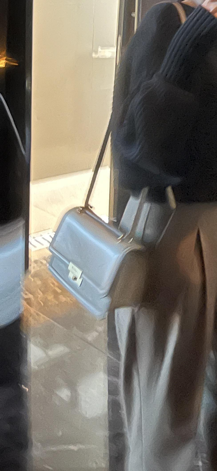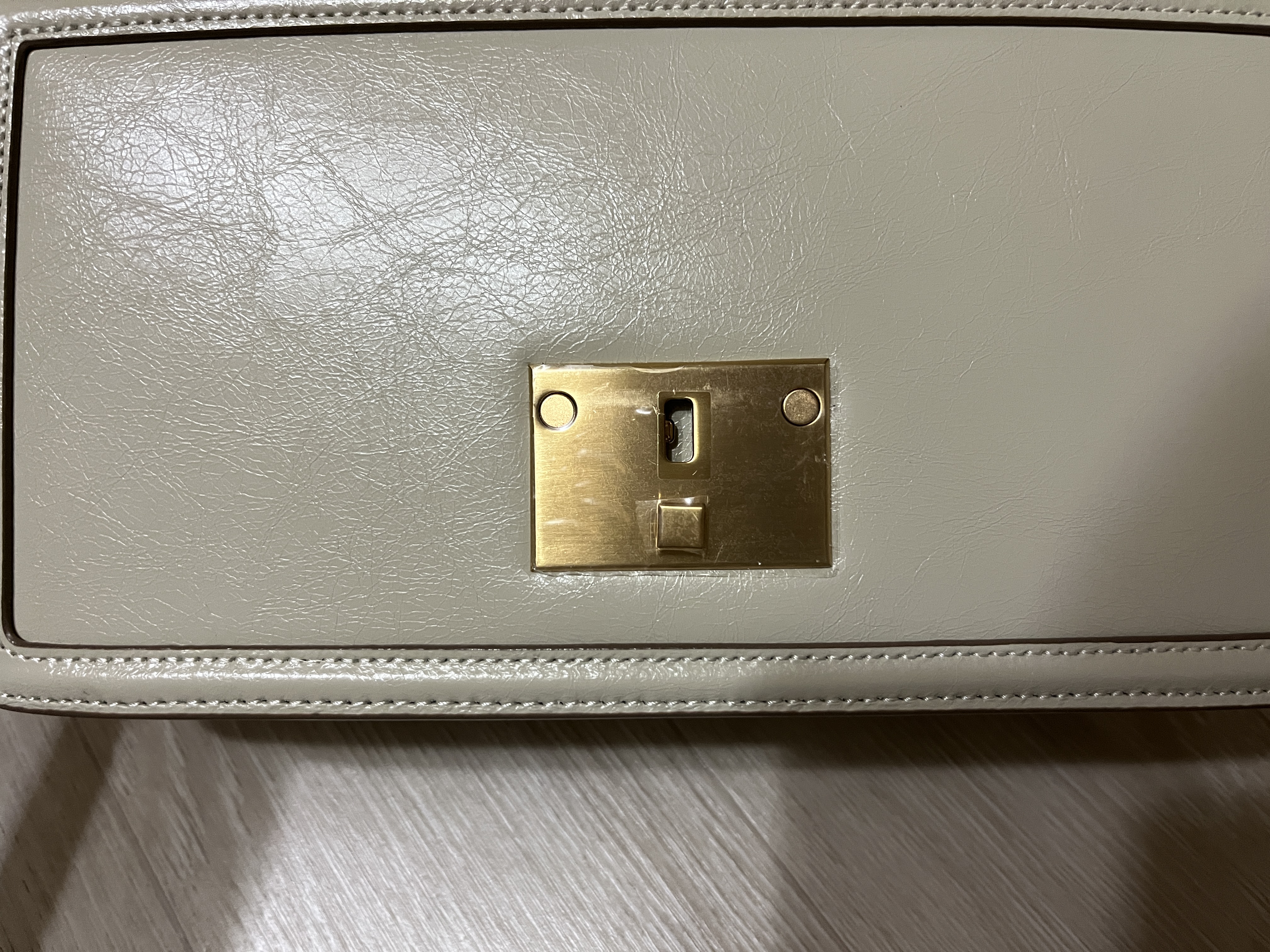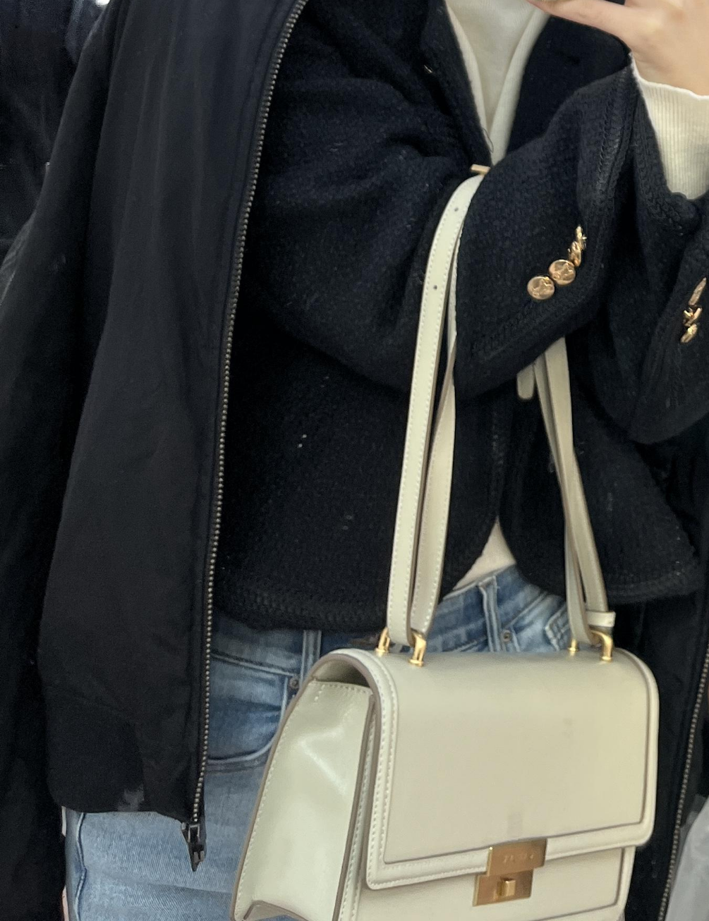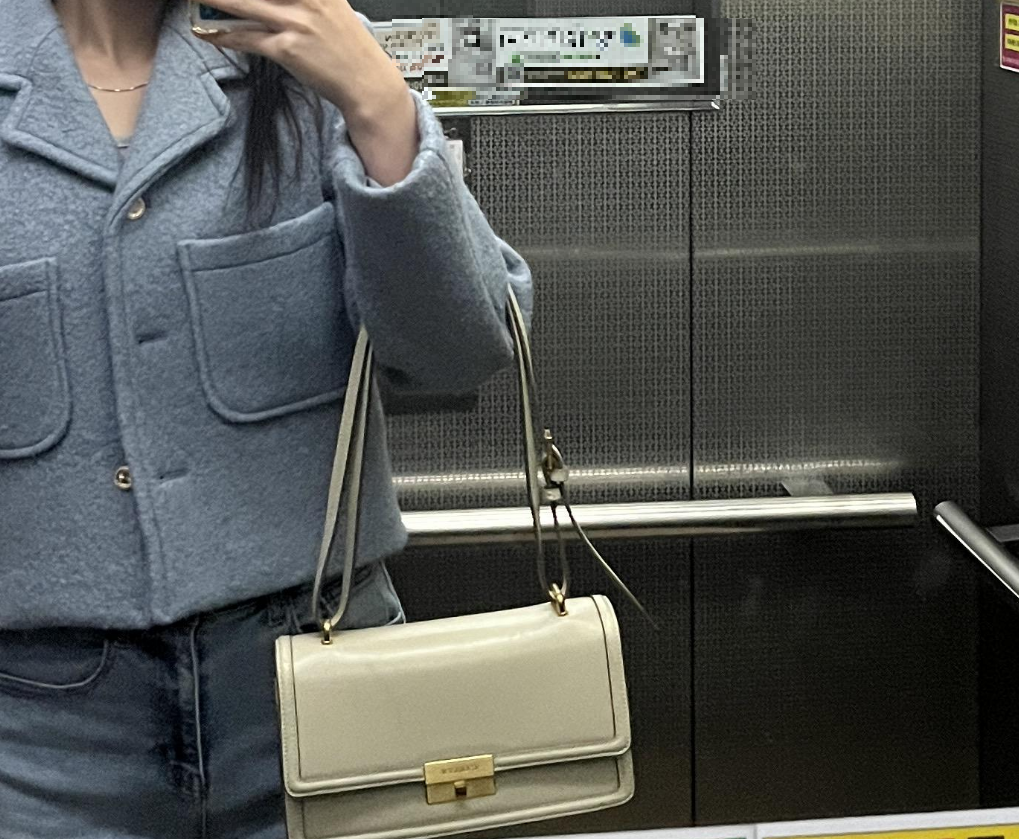 겉에 과감한스티치 디자인이 포인트이고 중간에 금색으로 오픈할 수 있는 디자인도 꽤 포인트더라구요. 곳곳에 금색이 들어가있어서 금색 악세사리 낀 날 매면 더욱 어울릴 것 같은 가방이에요. 크기는 옆에손이랑 비교했을 때도 두뼘정도 되는 가방 크기였어요ㅎㅎ