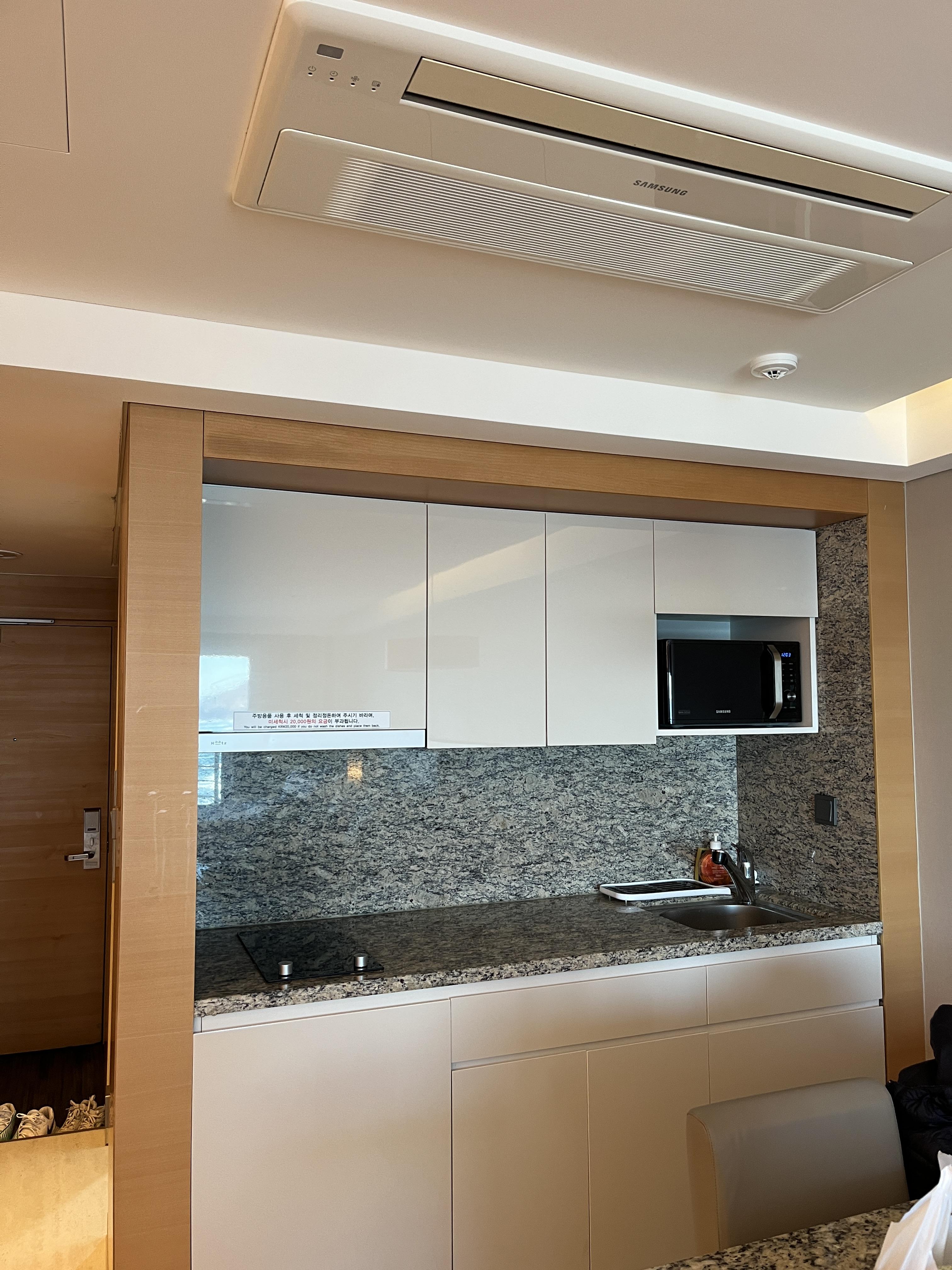 주방엔 간단한 칼이나 컵,도구 들이 있고 작은 냉장/냉동고가 있었어요. 그리고 전자레인지는 빵먹을때 유용하게 씀 ㅎㅎ