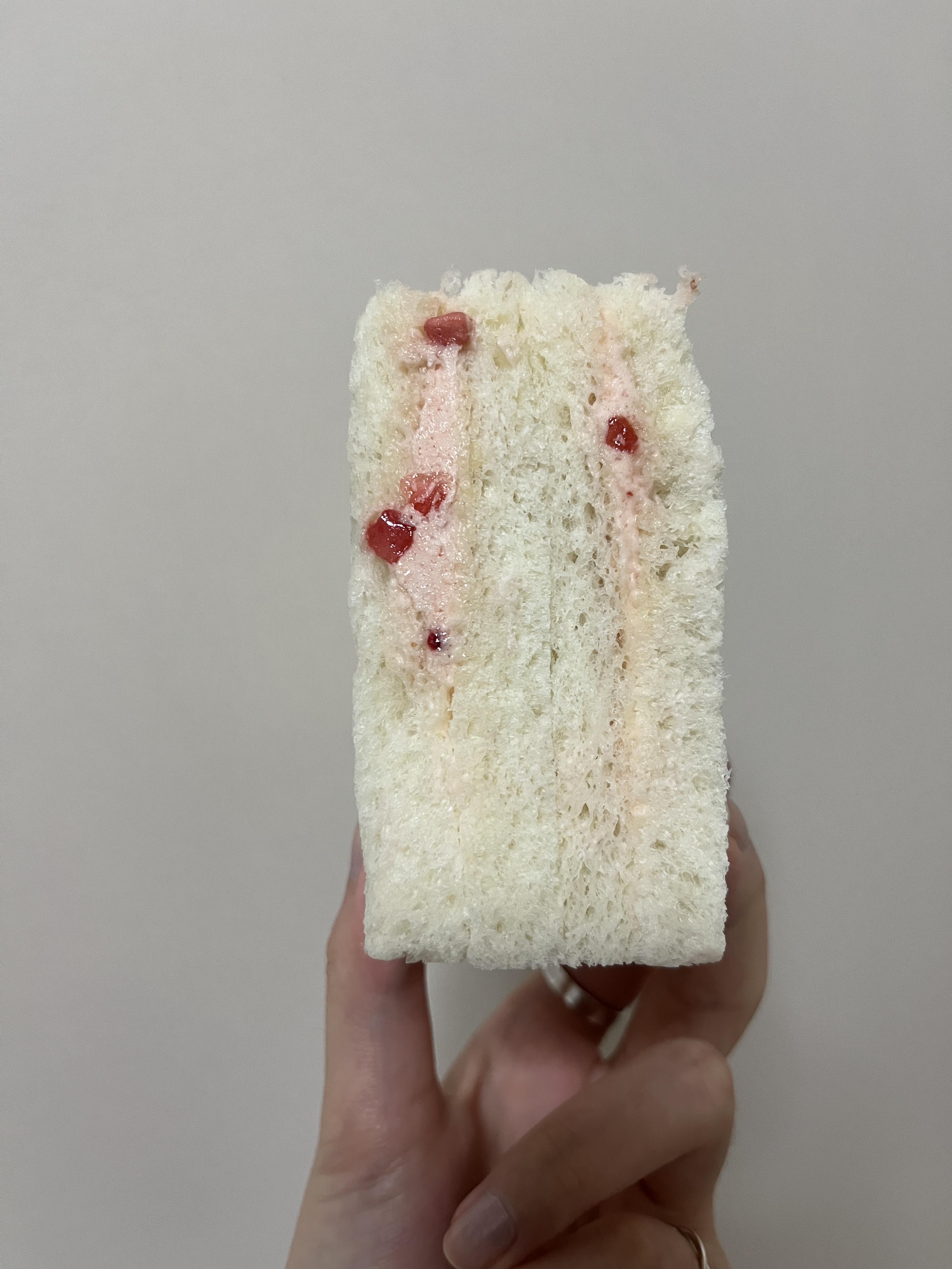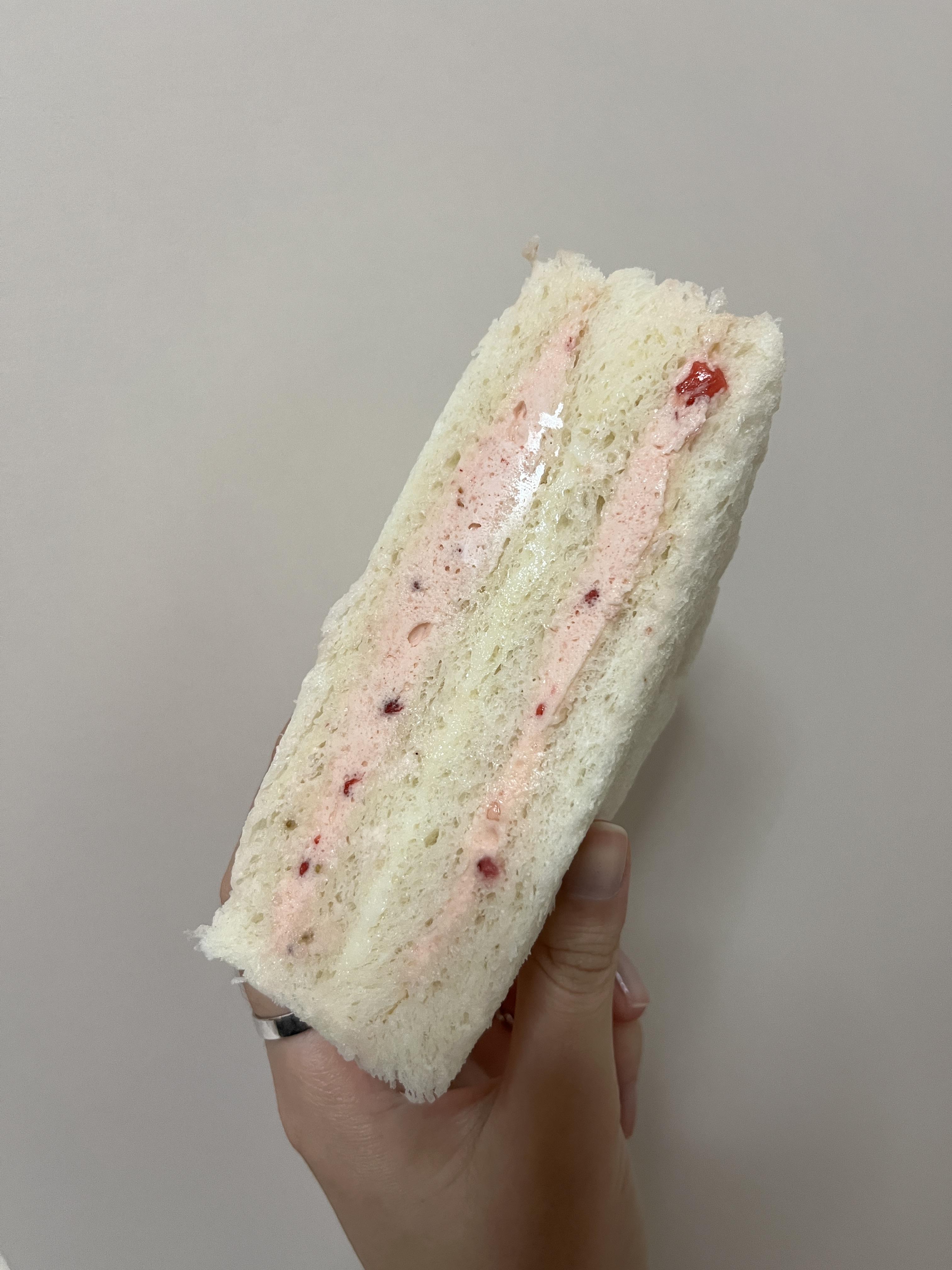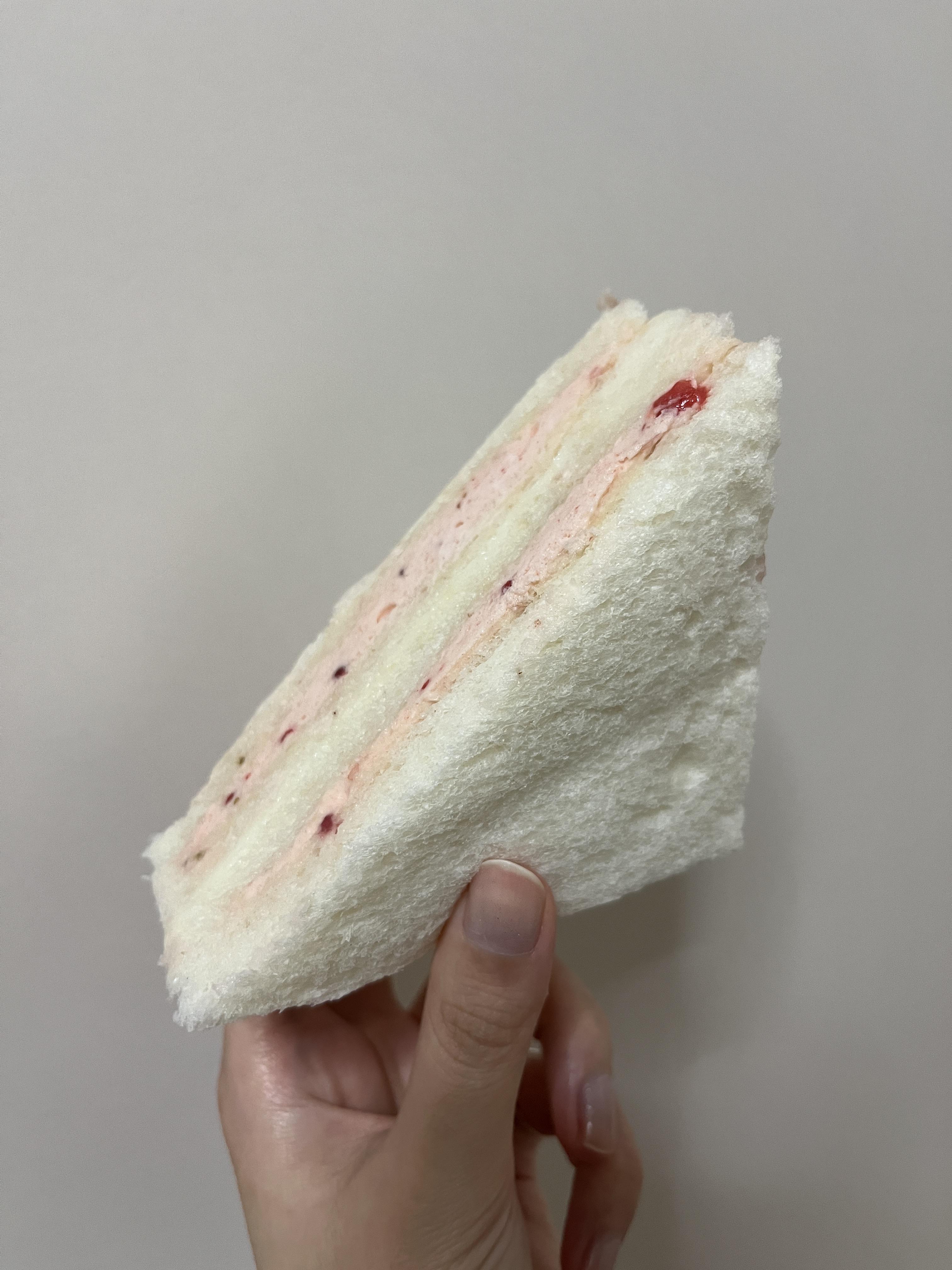 살짝 단맛이 강하다고 느껴지긴했으나 약간 얼려진 느낌으로 먹으니까 사각사각하는 식감이 딸기샌드위치 특성과 잘 어우러져서 더욱 맛있게 먹었어요! 단맛과 딸기의 씹히는 맛이 특징인 샌드위치에요 :)
