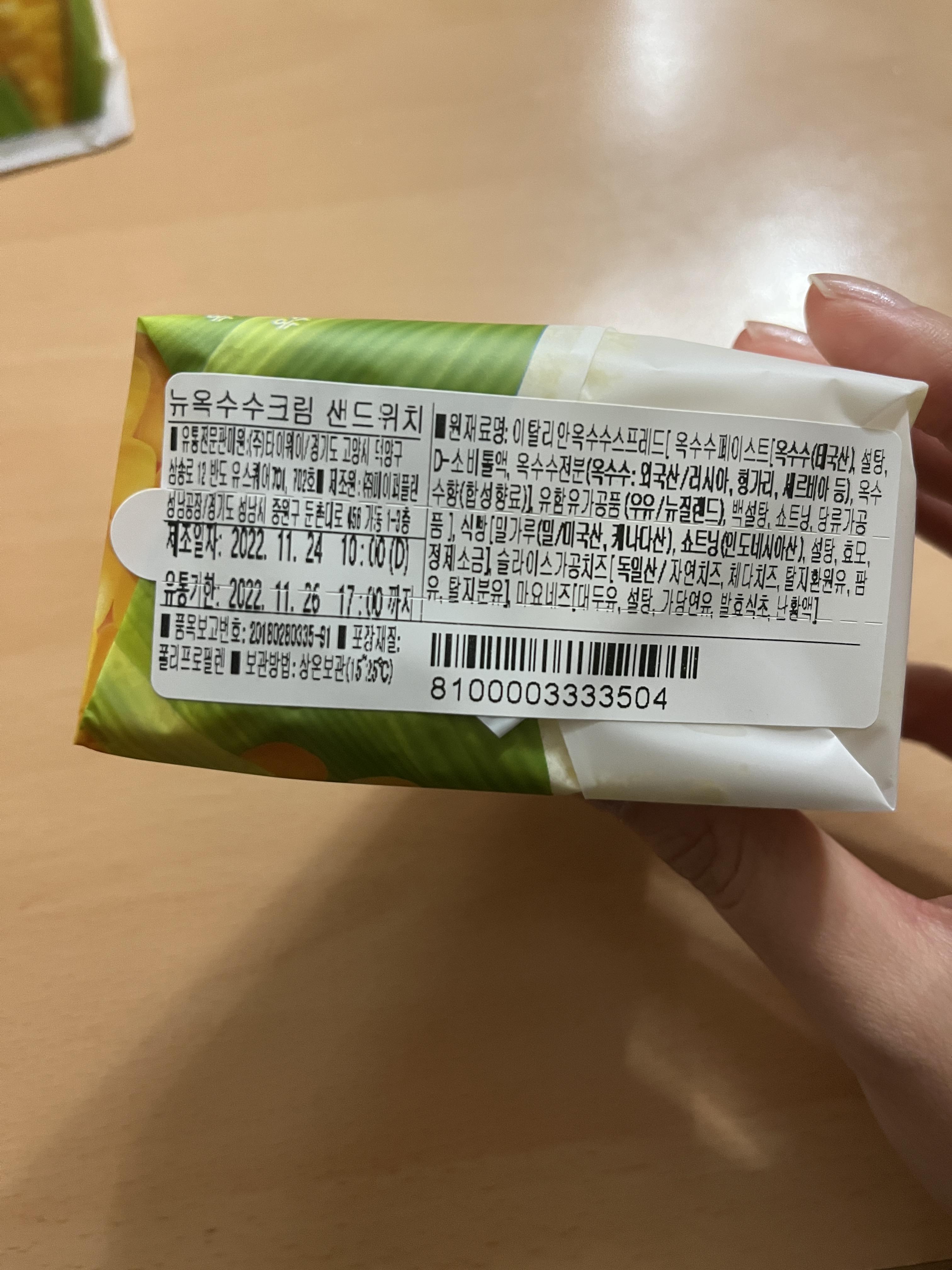 딱봐도 옥수수향이 찐하게 날것같은 샌드위치 패키지가 맛을 너무궁금하게 해서 제일 먼저 손이간 샌드위치에요!