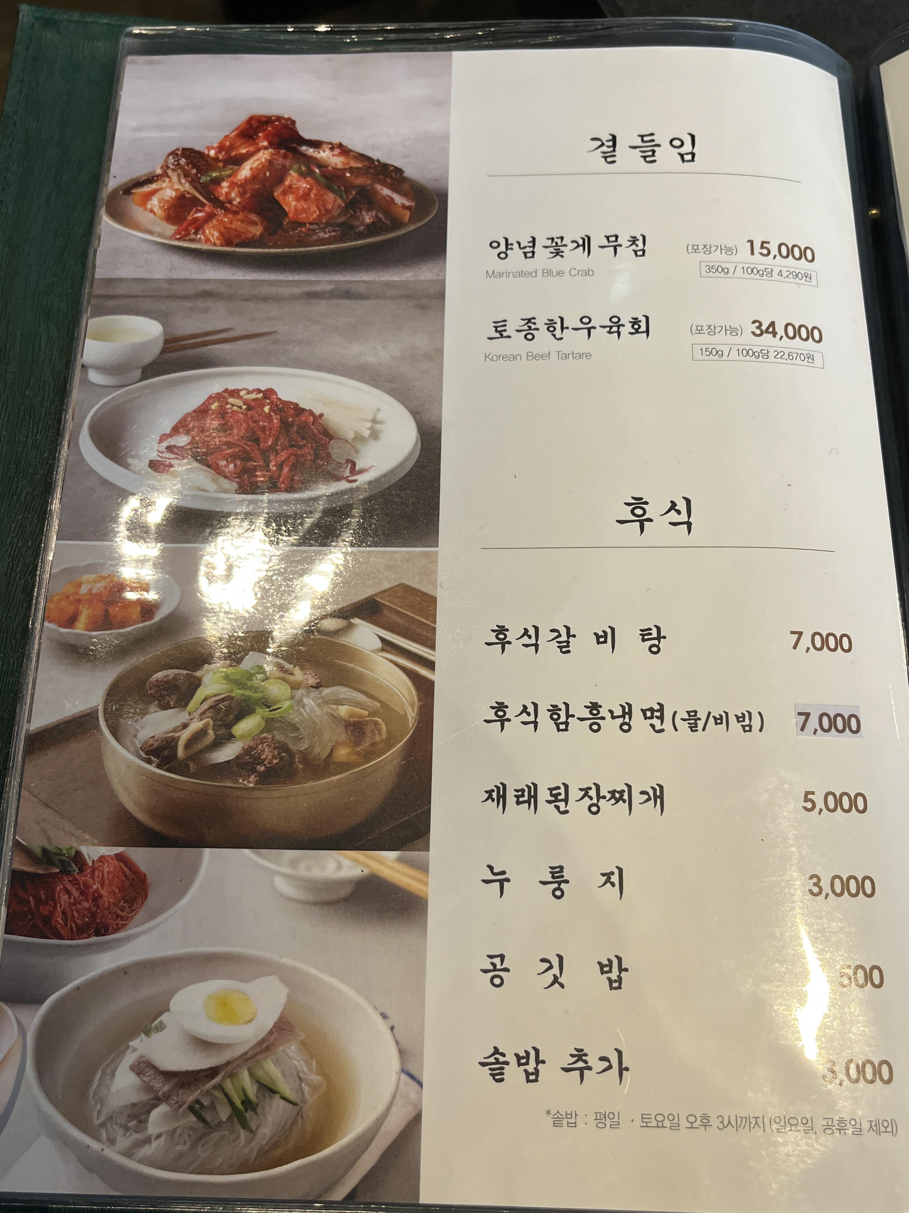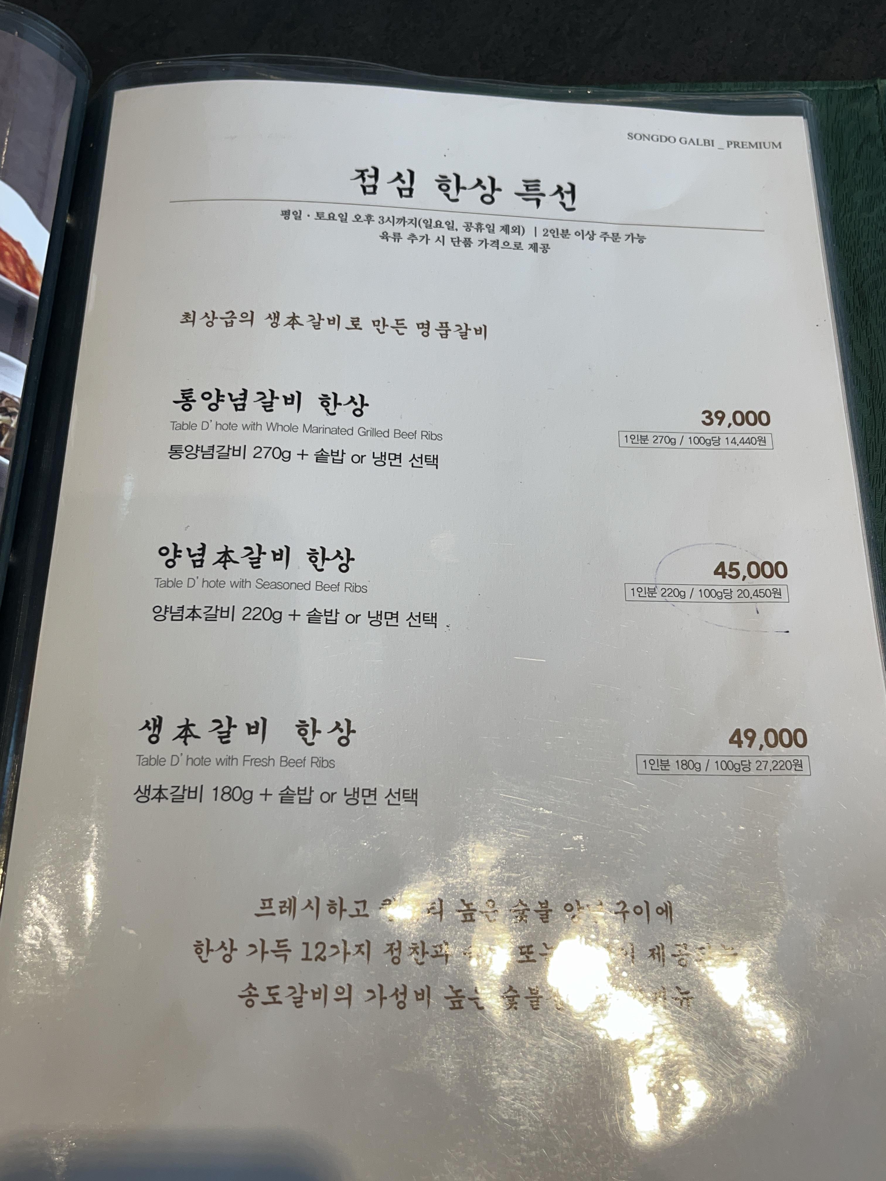 메뉴판은 아래를 참고해주시고, 저희는 식사까지 함께주는 한상으로 선택해서 생소갈비 한상과 양념소갈비 한상 이렇게 하나씩 주문했어요! (사실 1인분씩은 주문이 안된다고 하는데 그냥 해주셨어요 ㅠㅠ 친절하셨던 아주머니 ㅠㅠ)