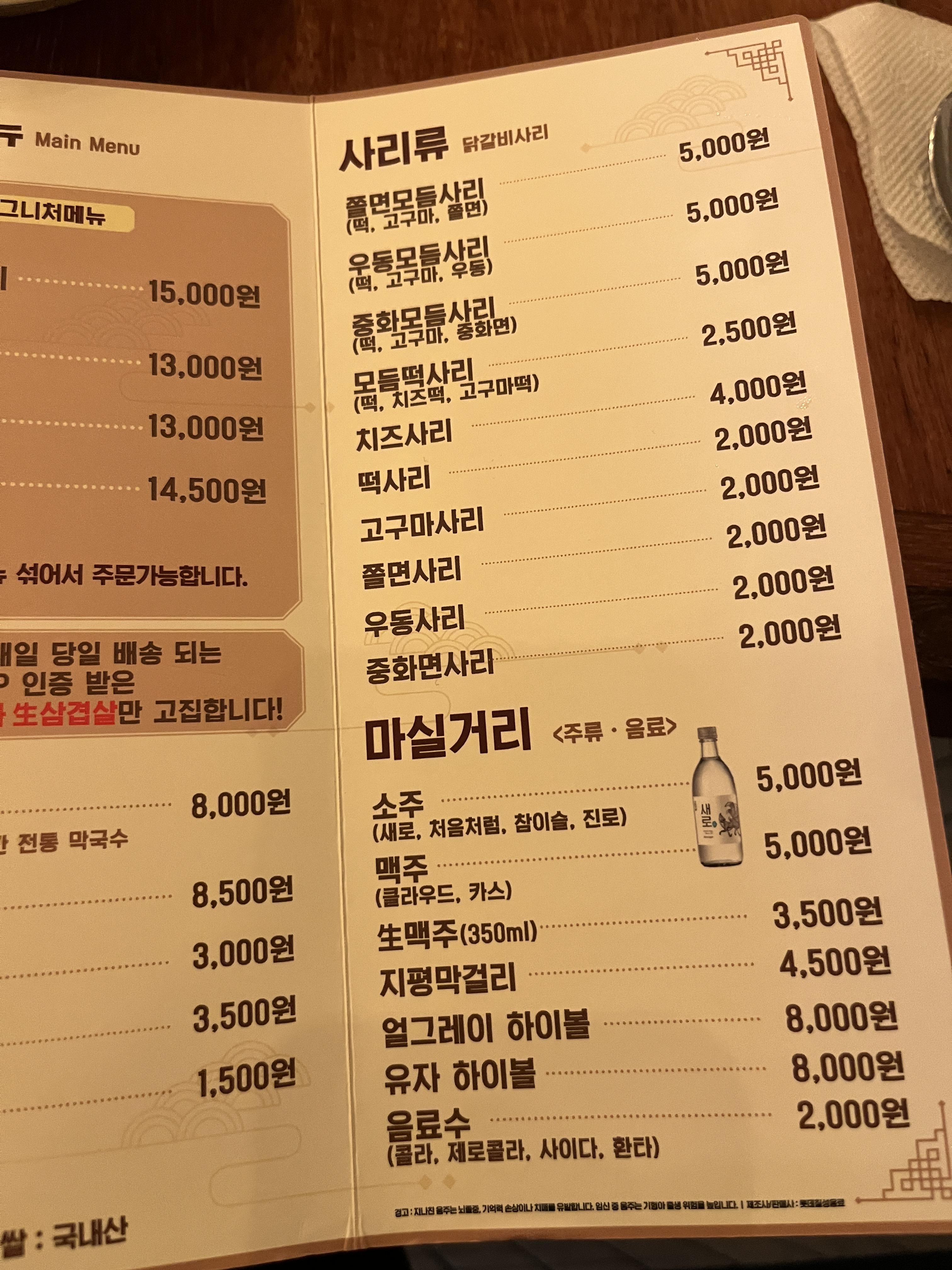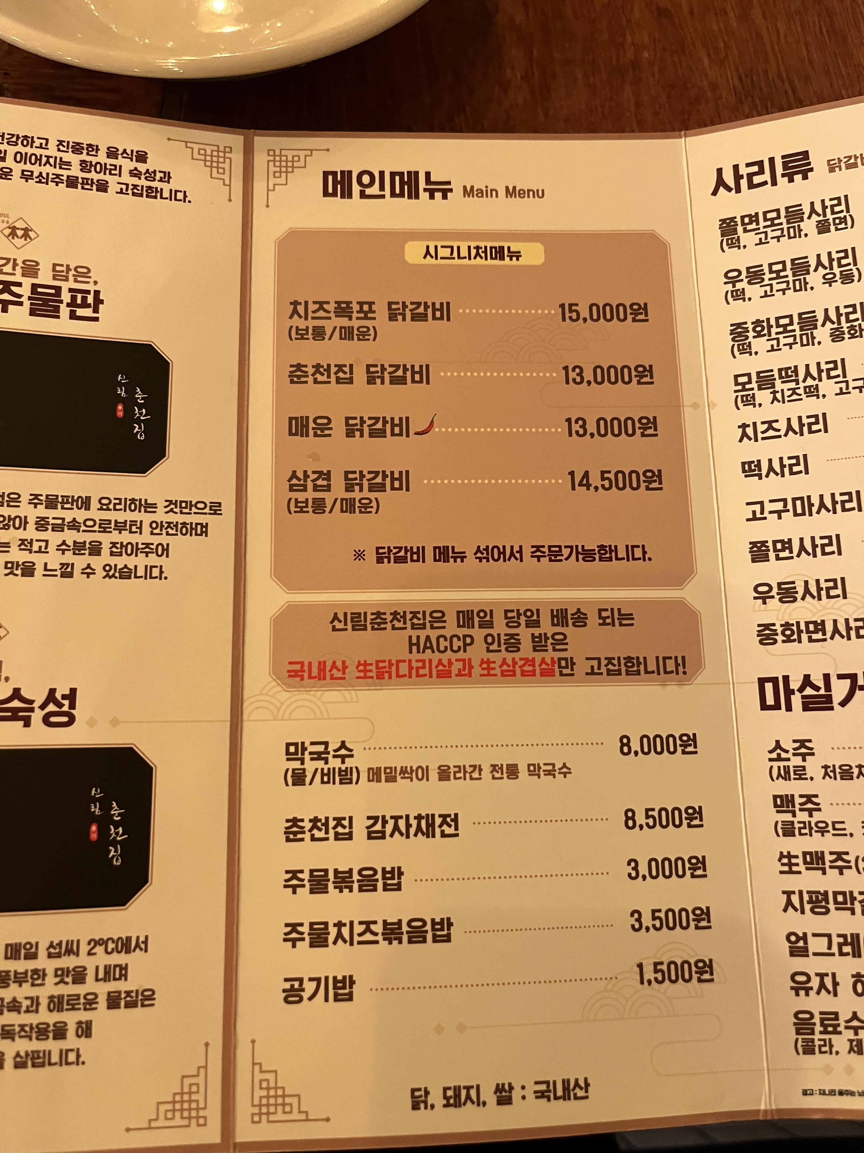 메뉴는 이렇게~ 중에 치즈폭포 닭갈비가 젤 유명한것 같아서 이걸로 시켜봤어요:)