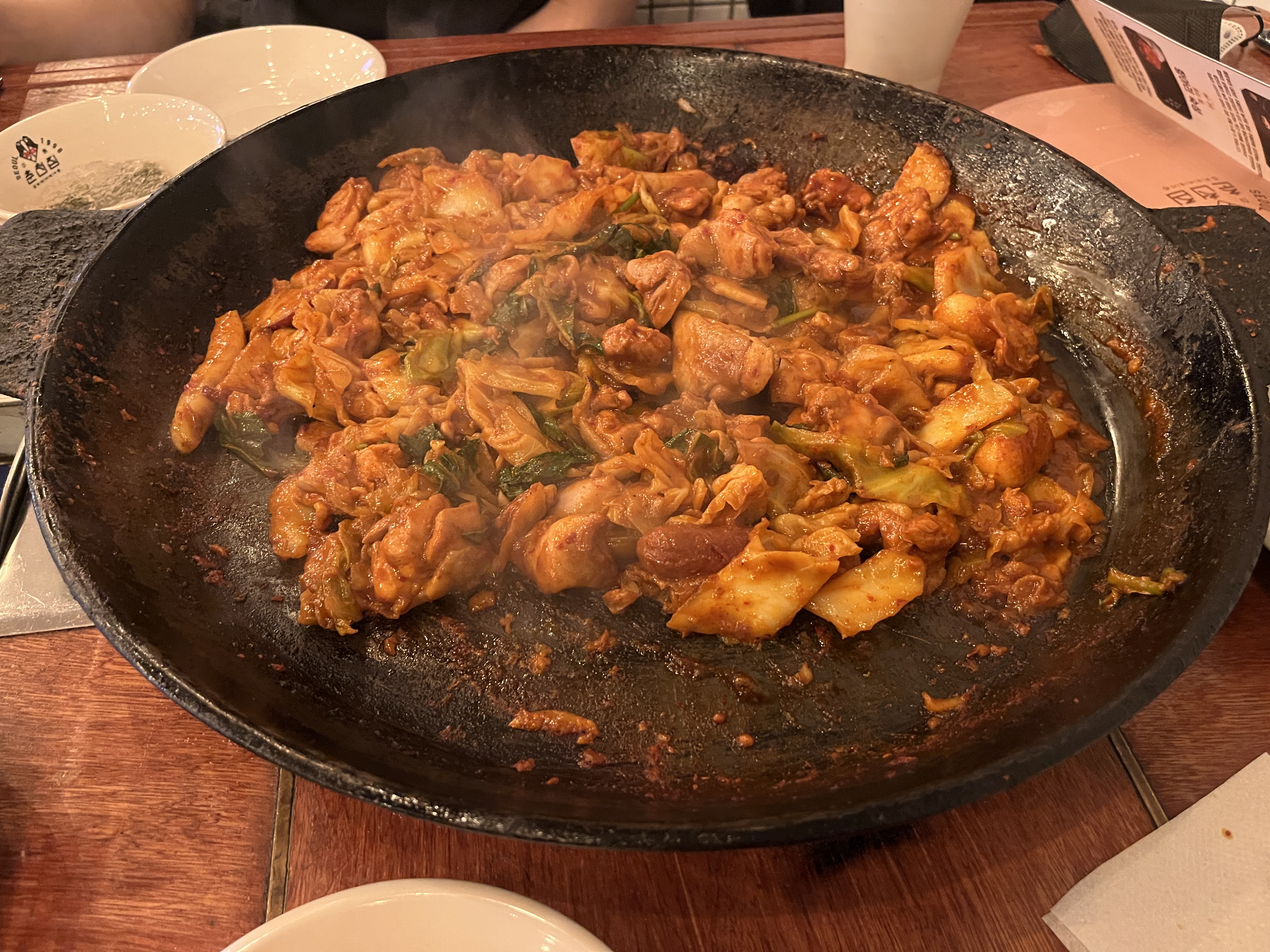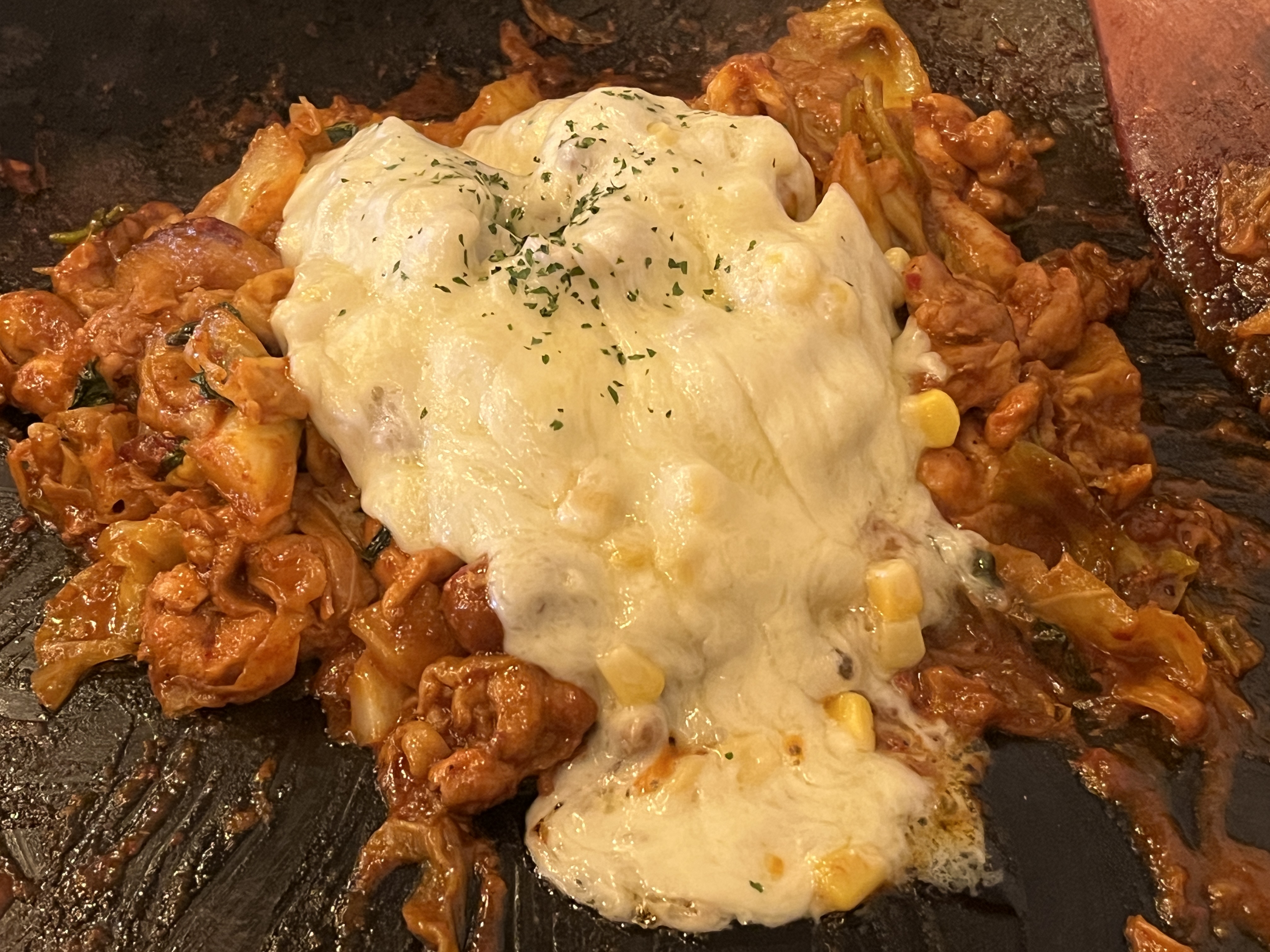 이렇게 후라이팬째 들고오셔서 뿌려주셨어요 :) 콘이랑 너무 잘어우러졌던 치즈향 ㅎㅎ 닭갈비의 닭들도 굉장히 부드러웠어요! 아쉽게도 볶음밥을 먹지는 못했지만, 닭갈비자체의 맛은 정말 평균 그자체!