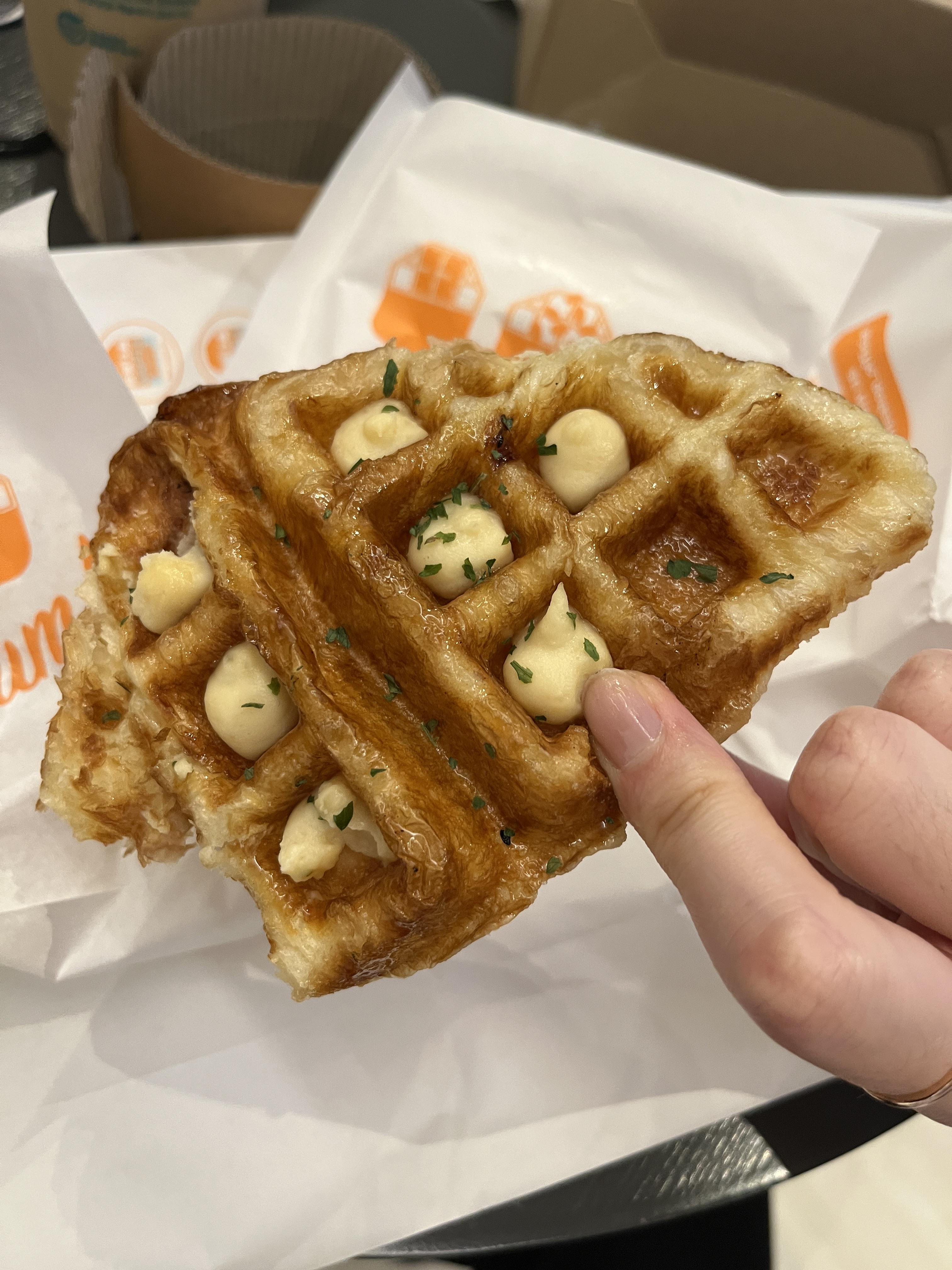 갈릭치즈 크로플. 요 아이는 크림치즈가 섞인 갈릭향의 크로플인데, 겉에 묻은 시럽이 오리지널 크로플보다 더 달게 느껴지더라구요. 오히려 달달한 시럽묻은 크로플을 원하신다면 요 아이로 추천드리고 싶어요!