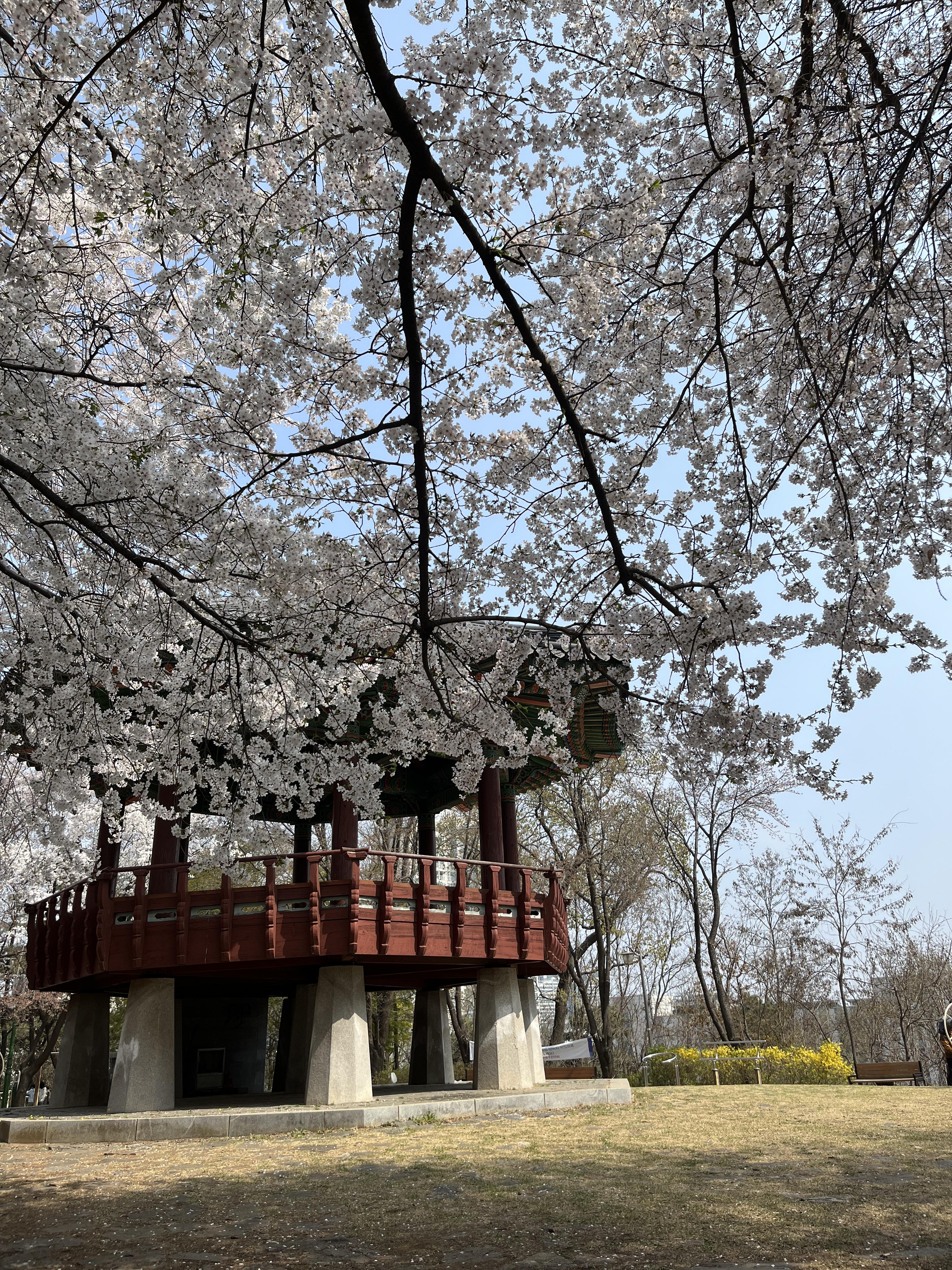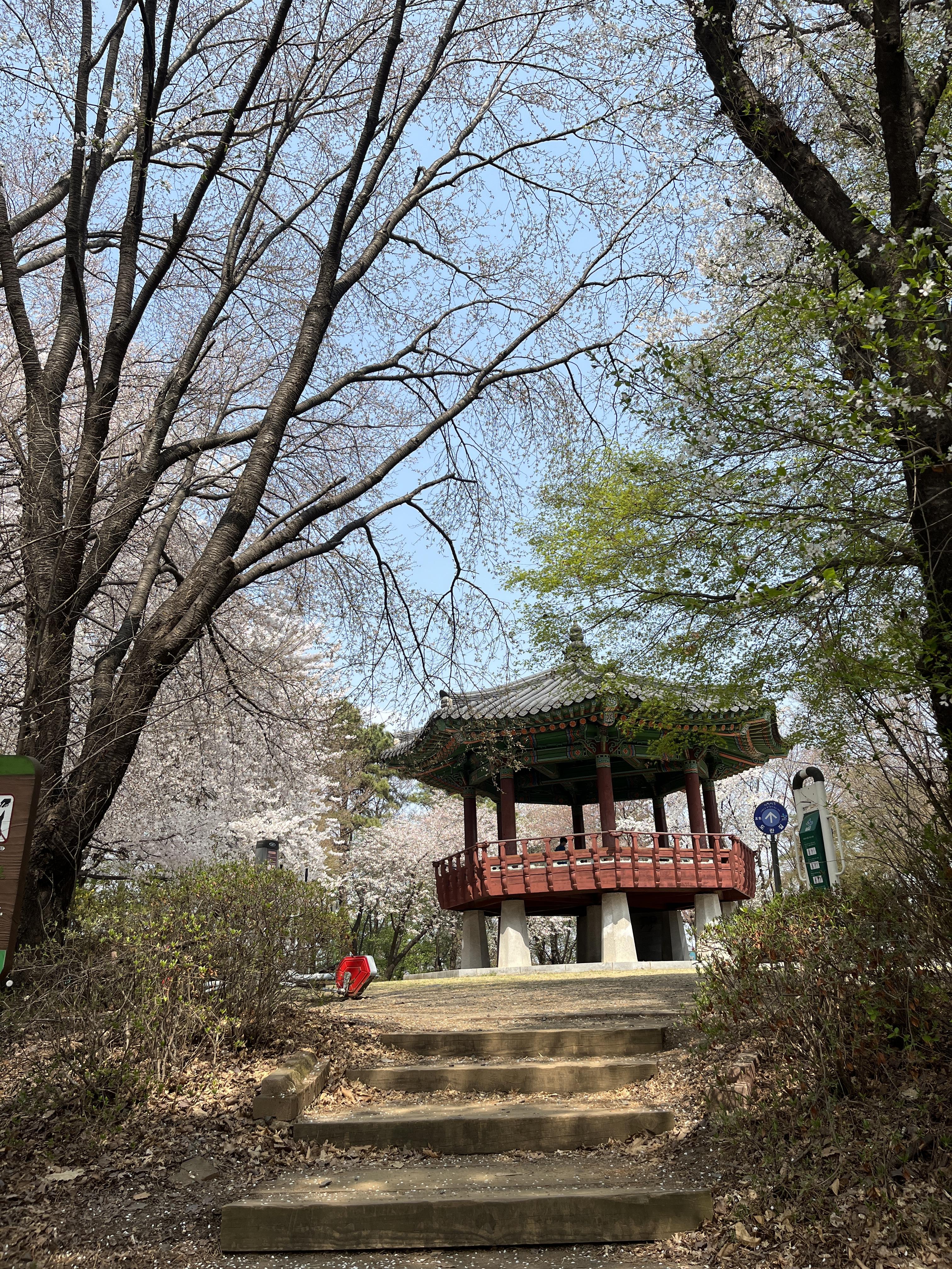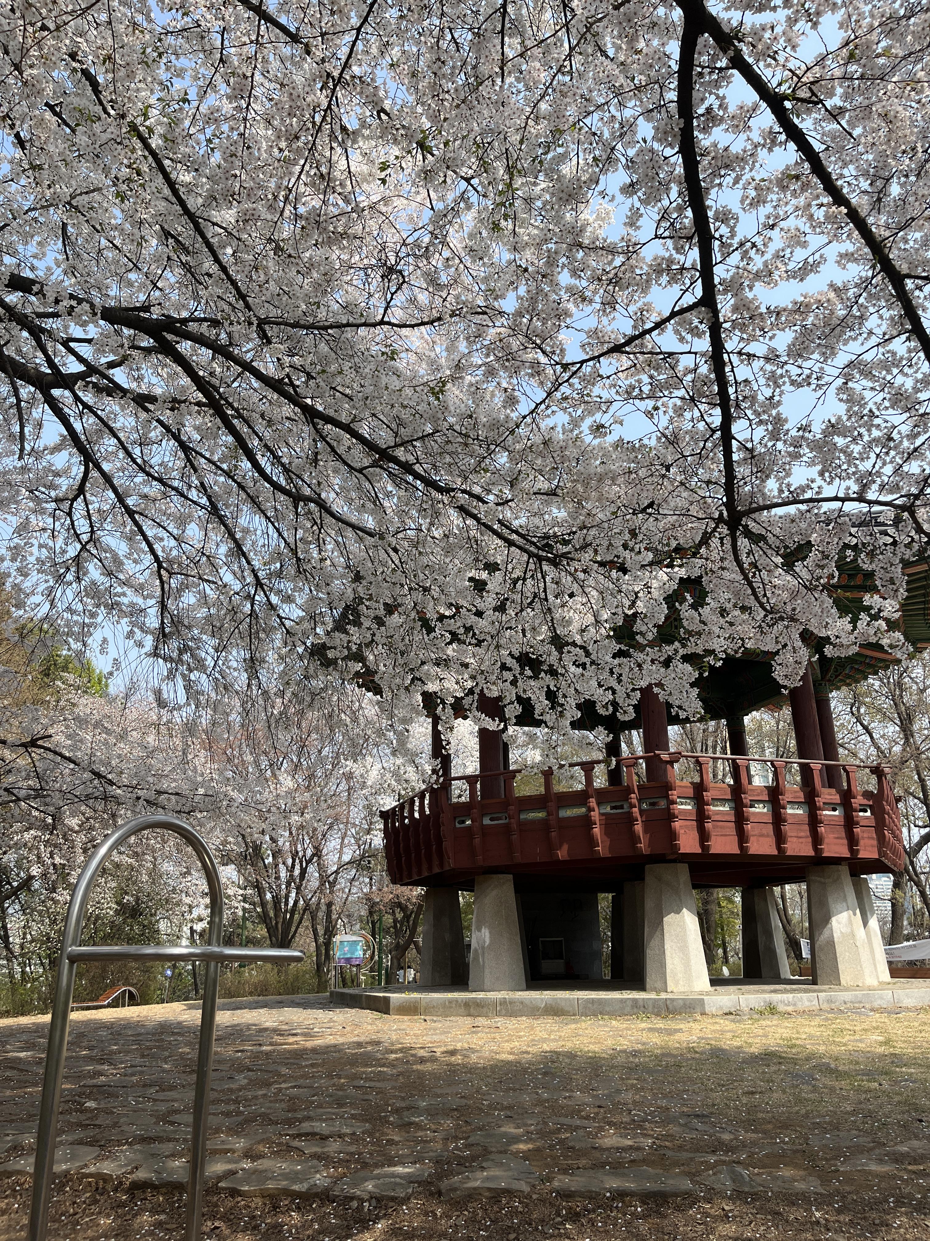 너무 일본 애니 포스터 느낌의 감성적인 공간이었어요,,!✨ 이곳은 정말 오래도록 변하지않는 공간이던데, 아직도 너무너무 예쁘더라구요. 정자 위에 올라가서 사진찍으면 너무 예쁜 프사를 건질 수 있고, 아래에서 벚꽃 구경하며 떨어지는 잎 잡아보는 것도 너무 재미있고요!