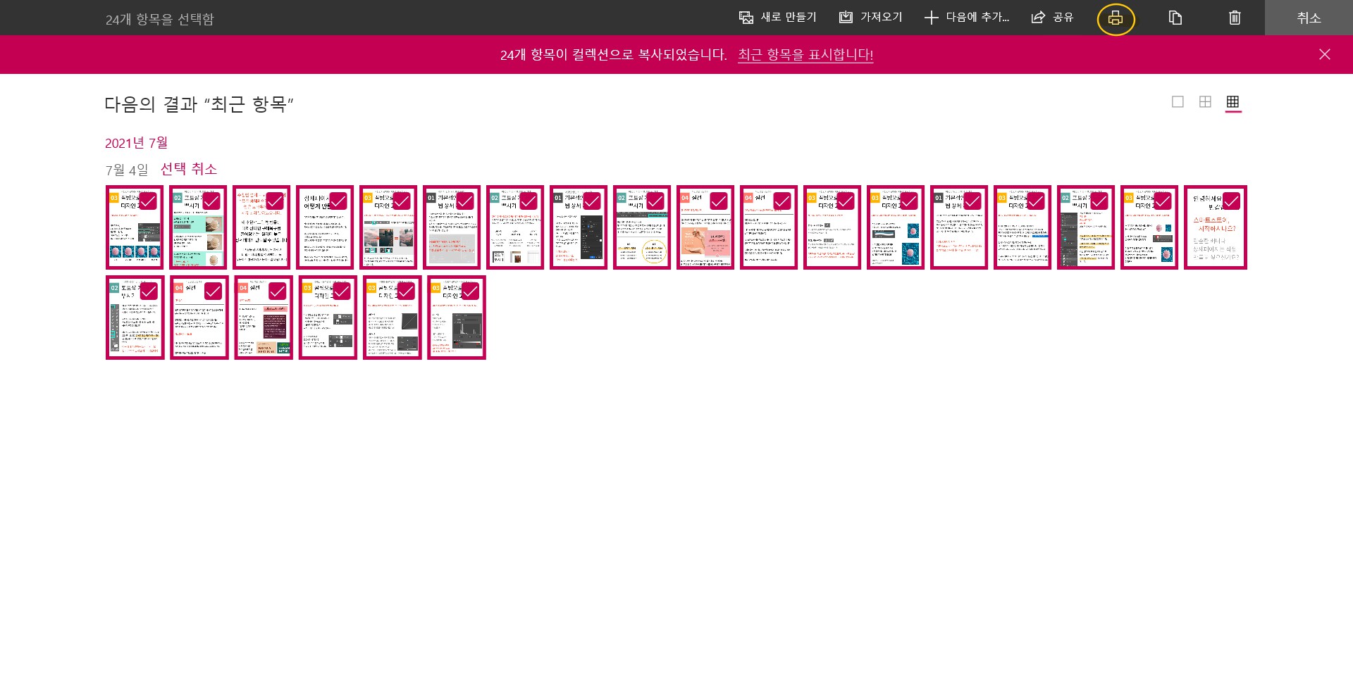 6. pdf로 만들 이미지들을 모두 선택해주세요. 선택후 상단에 인쇄모양 아이콘 클릭합니다.