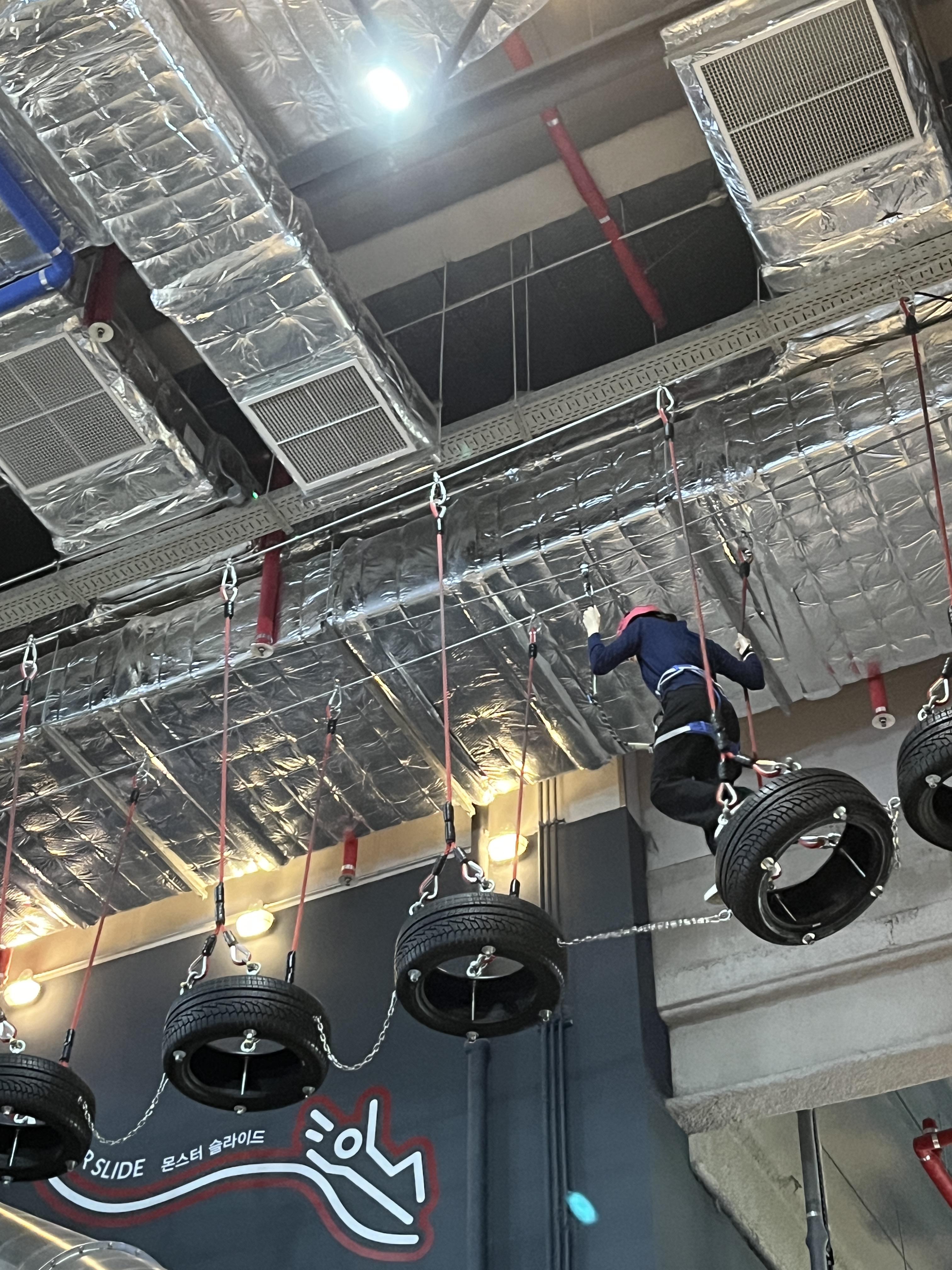 자 이제 이걸 하러가볼건데요! 블로그 후기에서도 많이봐왔지만 사진상으로는 그렇게 안무서워보여서(?) 할 수 있다! 하고 장비 착용하고 올라갔는데 웬걸... 바닥에 망사(?) 같은것도 없고 생판위를 걸어야하더라구요? 당연히 안전장치가 있어서 떨어져도 그 장치가 잡아주겠지만 ㅠㅠ 1단계~4단계가 있는데 2단계까지 지나야 중간 포기를 할 수 있대요 ㅎ..ㅎ