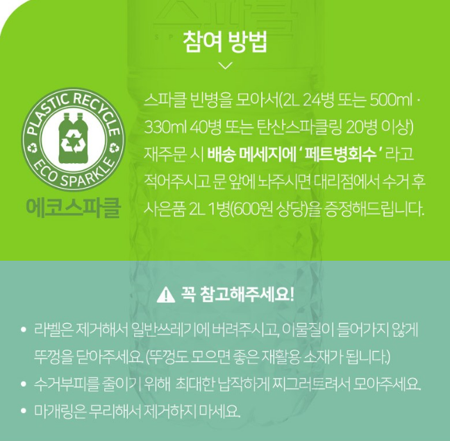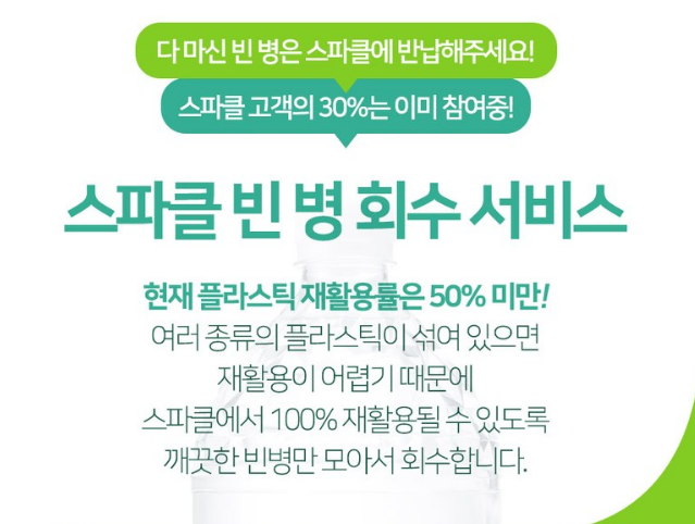 500ml의 생수를 구매해야한다면, 이걸 추천드리는데요. 그 이유는 '스파클 빈 병 회수 서비스'가 애초에 무라벨인 생수병을 빈병을 모두 모아서 내놓으면 수거해 가신다는 거에요! 또 모아간 생수병은 100% 재활용 된다고 하여서 너무 좋은 것 같아요 ㅎㅎ
