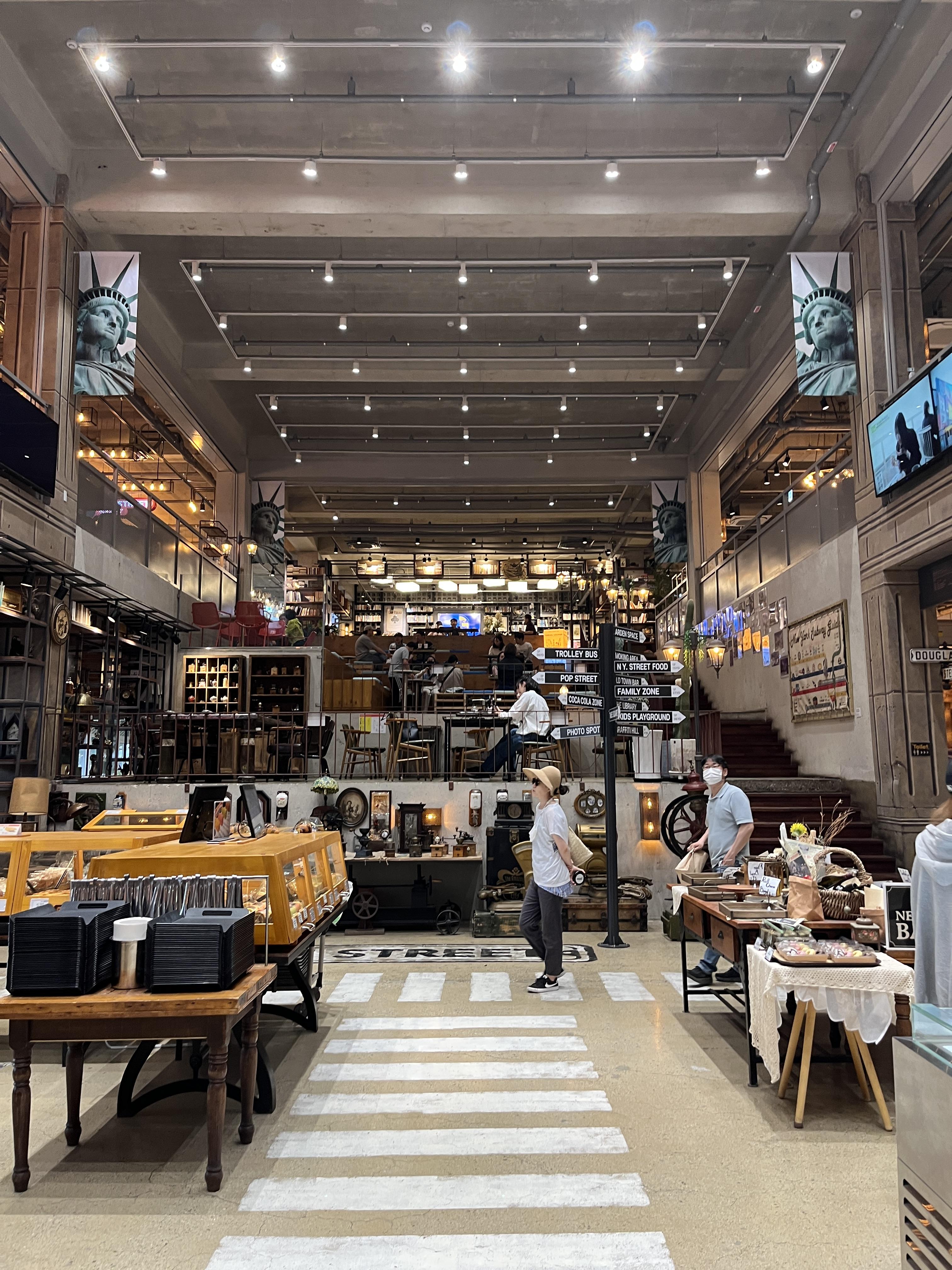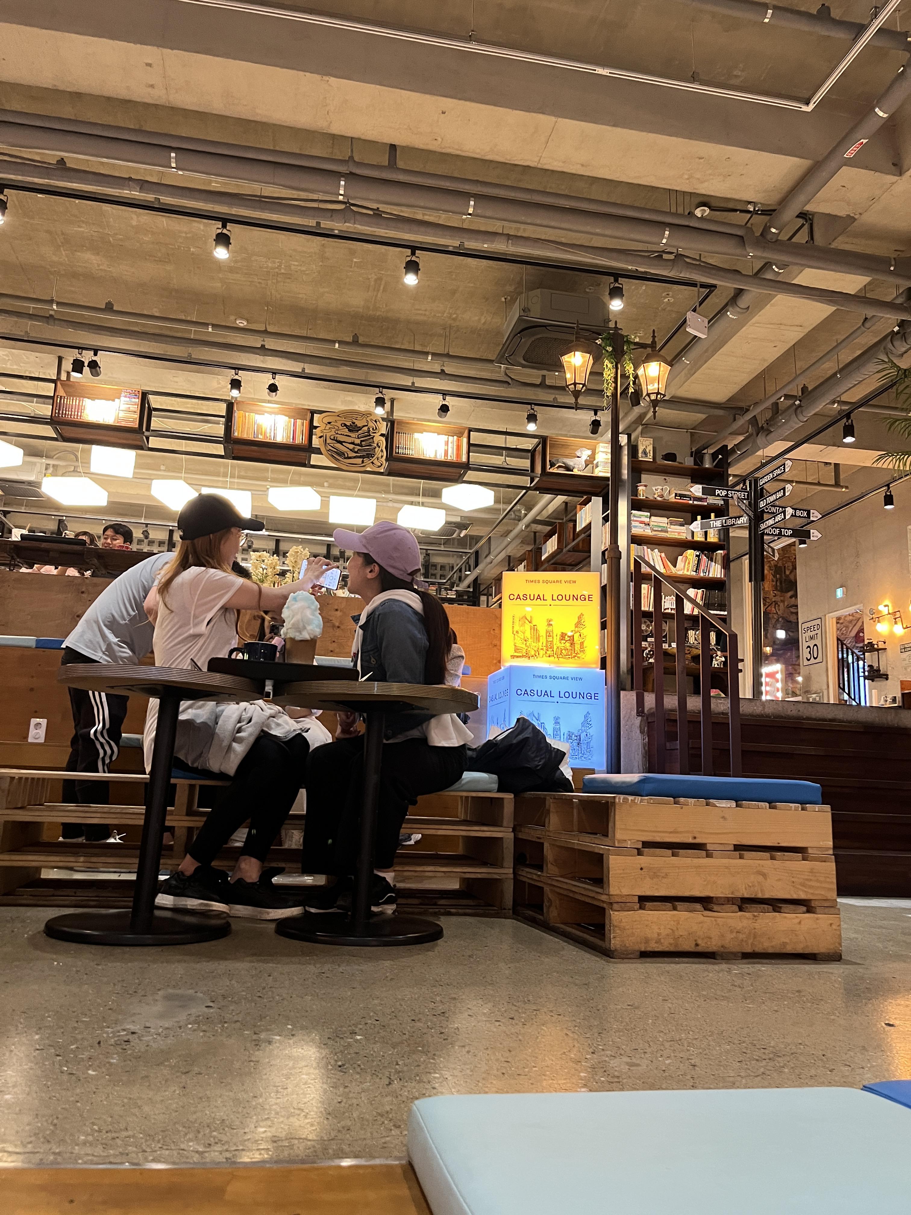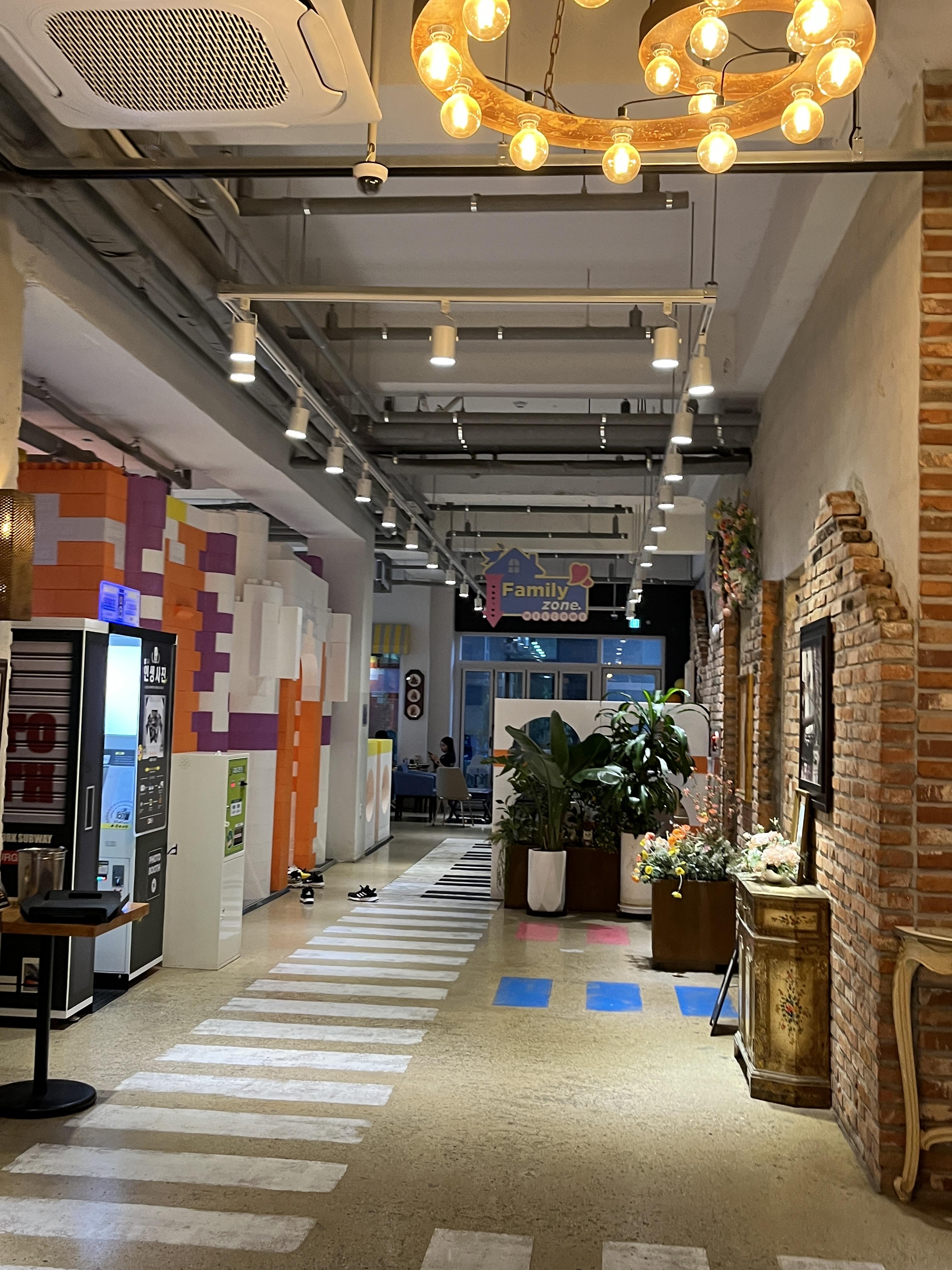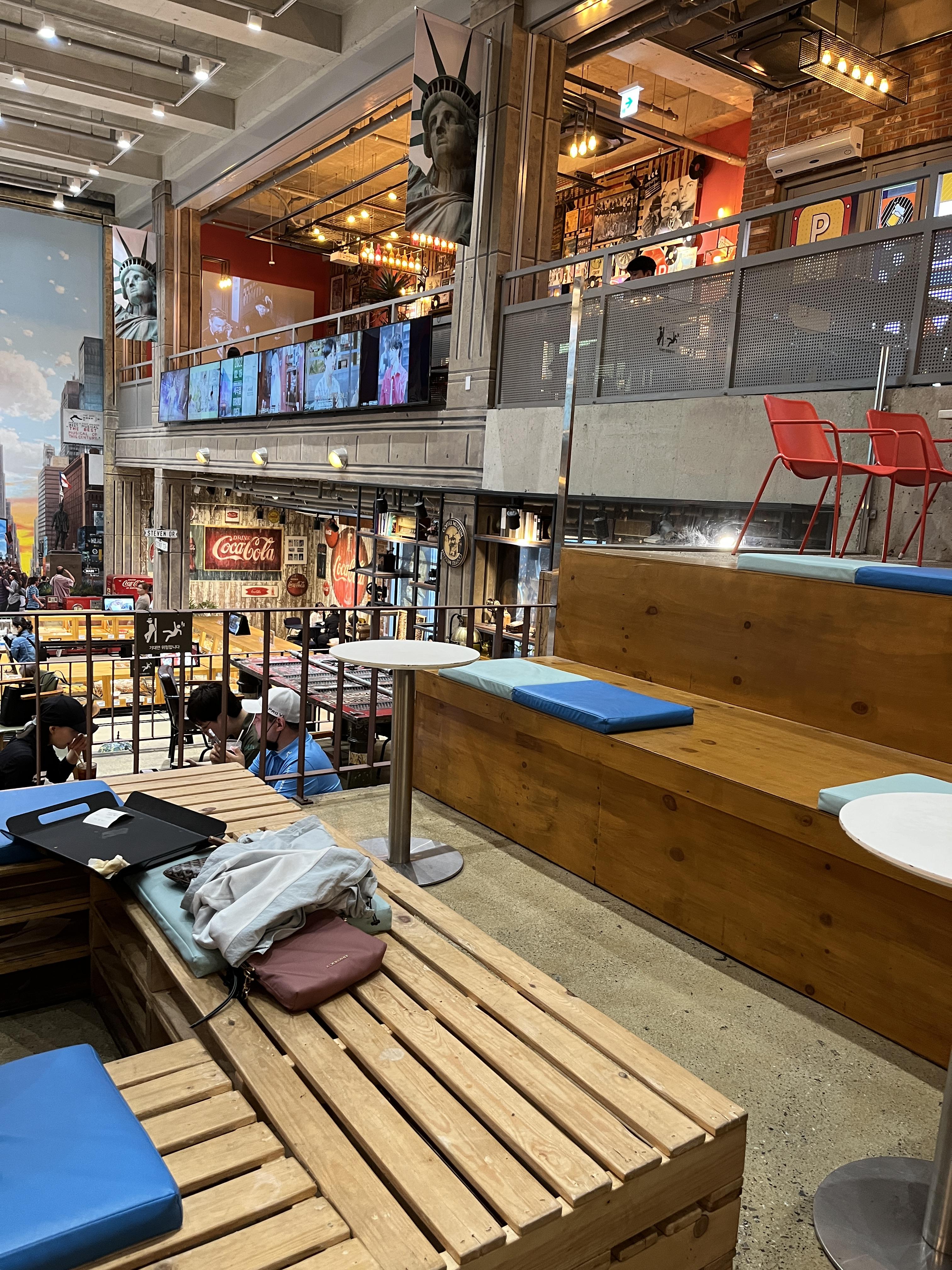 내부도 굉장히 넓고 힙하고 이름다운느낌의 공간이에요! 좌석도 다양하고 뒤쪽은 아이들이 놀 수 있는 공간도 있더라구요. 저희는 중간쯤 올라와서 한눈에 내려다보이는곳에 앉았어요 ㅎㅎ