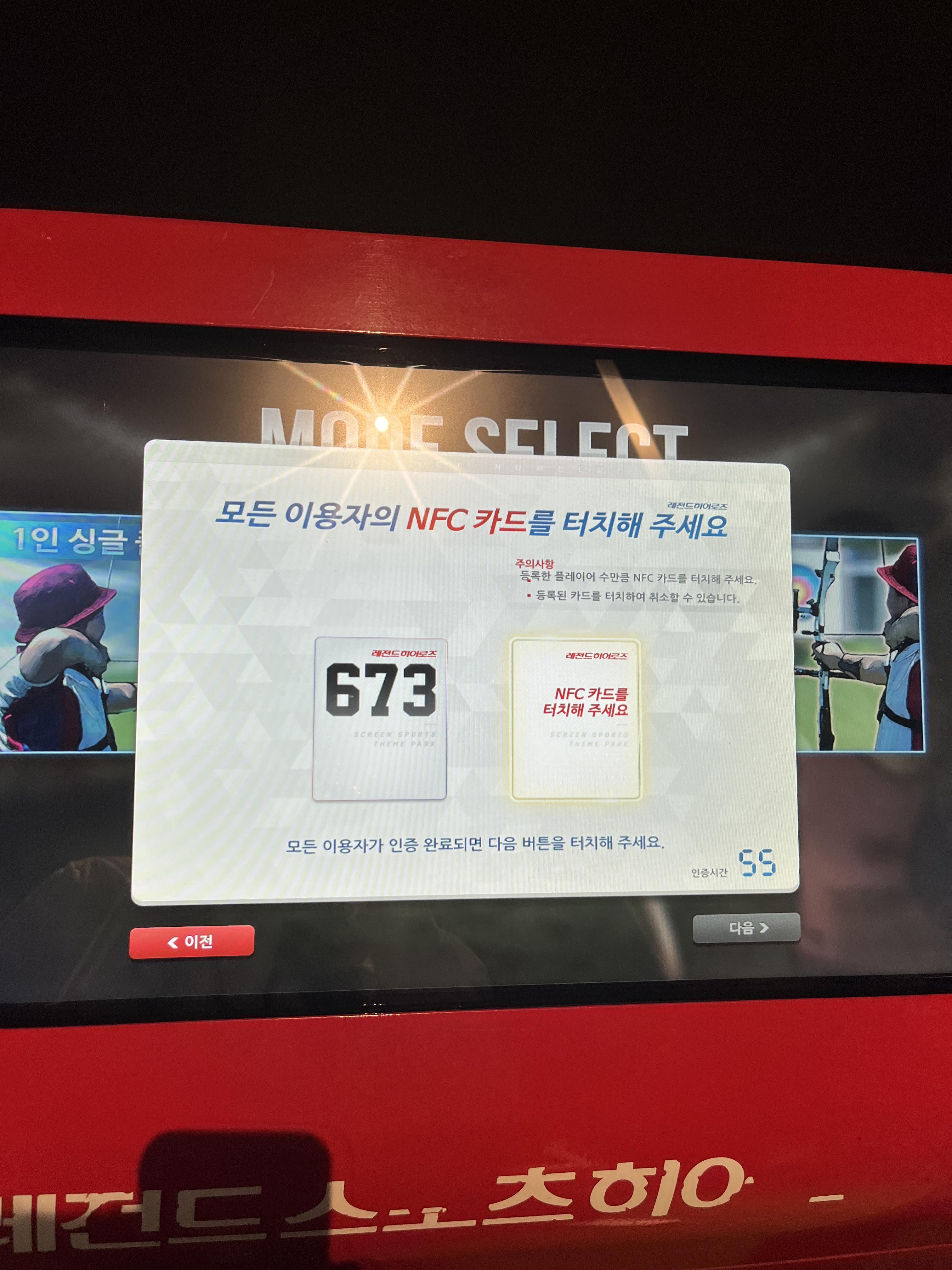 대기순서가 되어서 찍은 후에 두명이서 함께하는 게임을 선택했더니 이렇게 같이하실 분의 이용카드를 찍으라고 떠요!