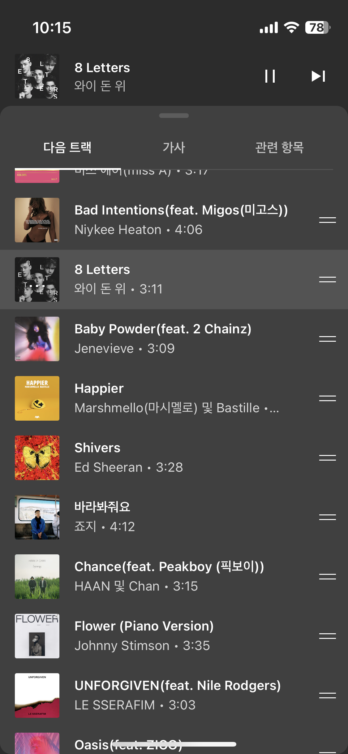 8 Letters 는 너무 띵곡ㅠㅠ Baby powder 피쳐링버전 처음들었는데 좋아서 자주듣고있다 ㅎㅎ