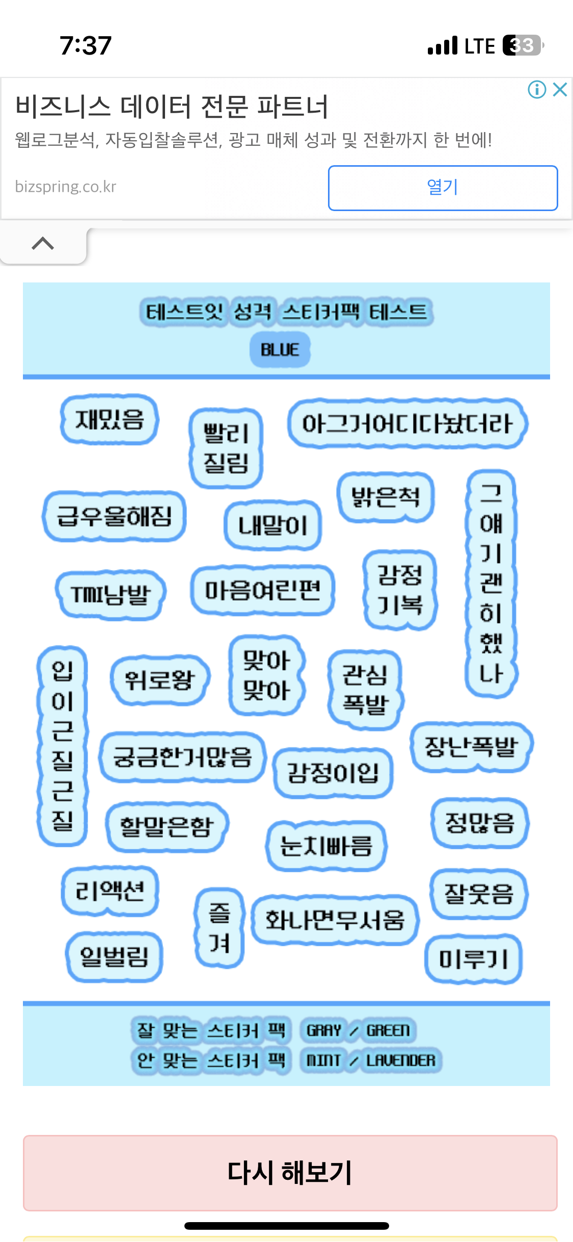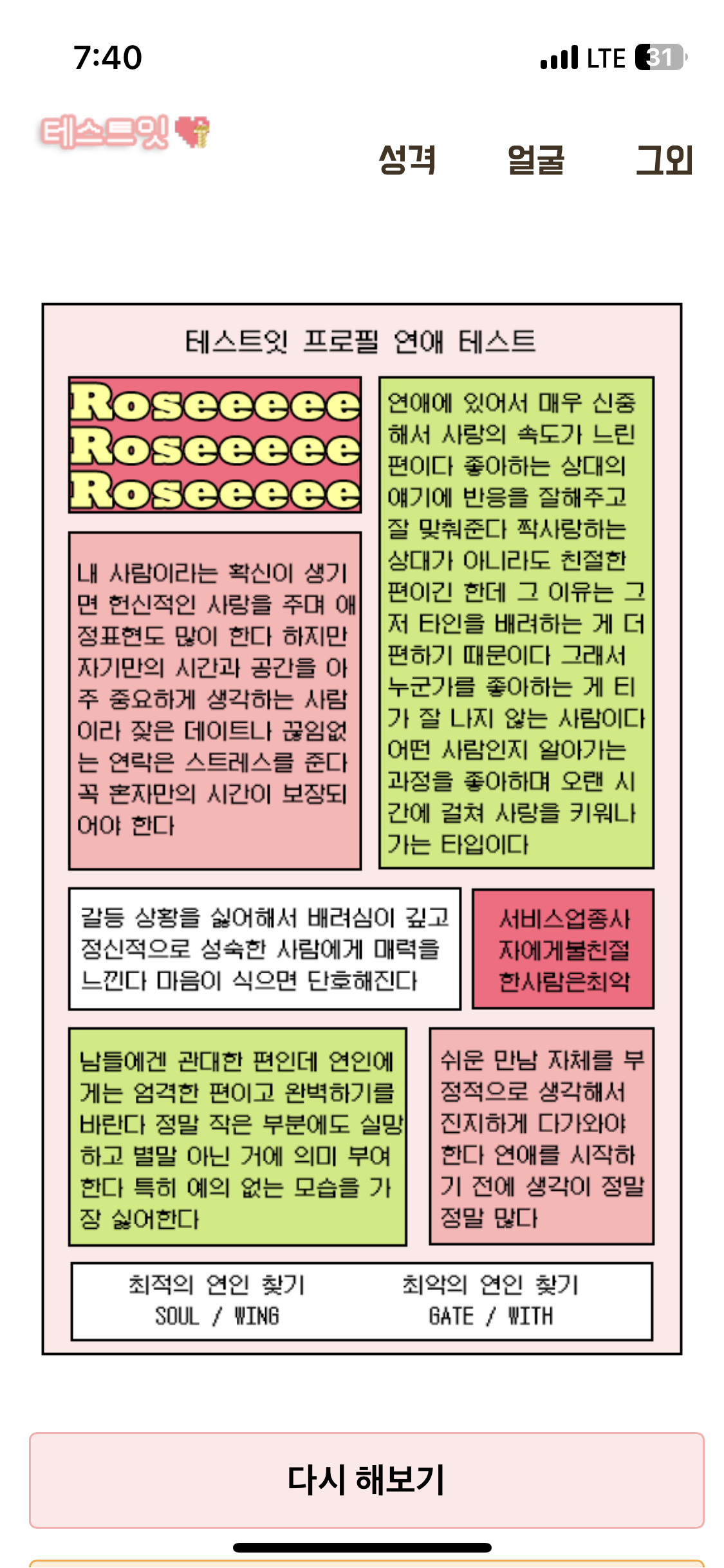 재밌었던 테스트 ㅎㅎ 꽤 잘맞아서 넘 재밌다 사람마다 다르게 나오는것도 신기해!