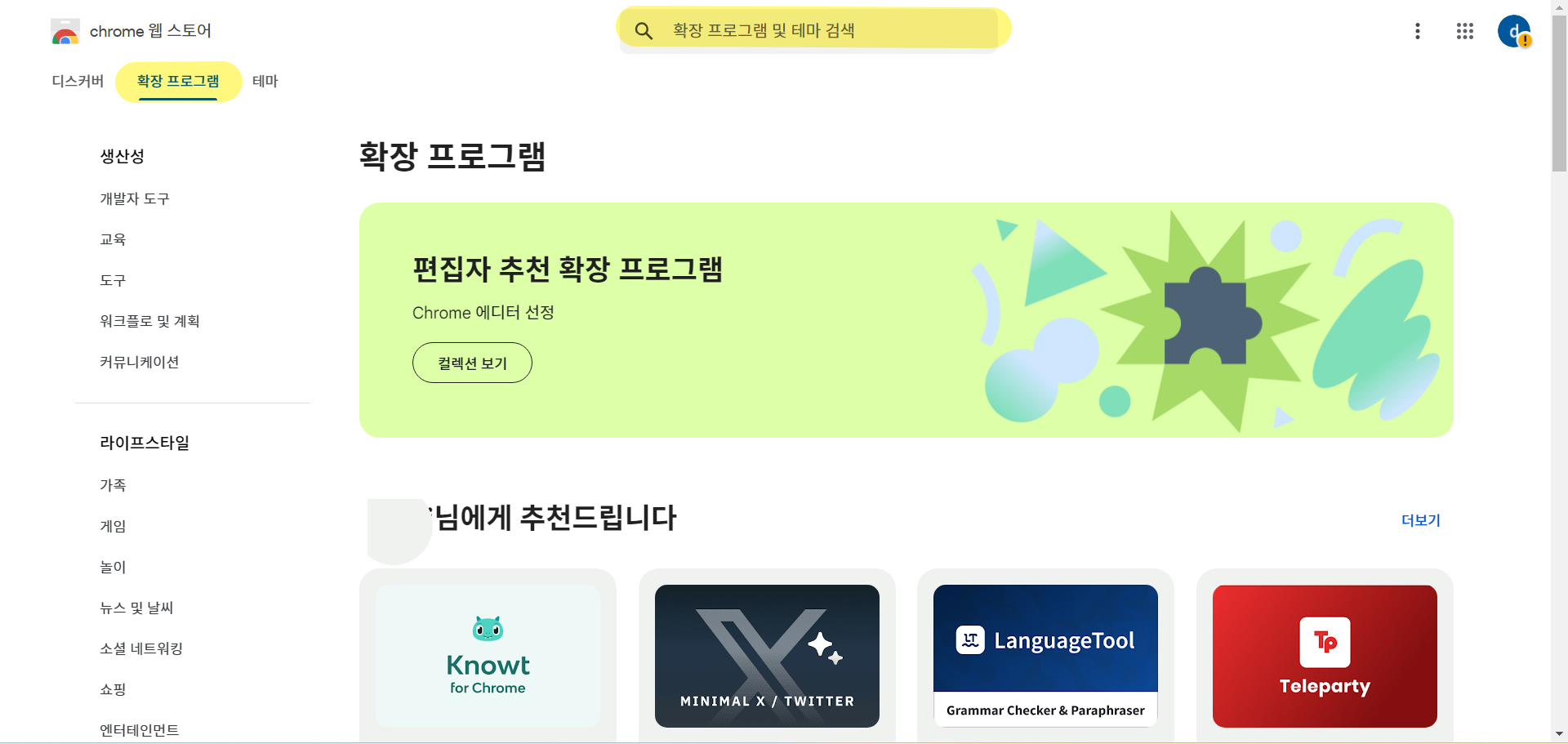 1. 로그인 후 우측에 동그라미 세개 있는 버튼 클릭 > 확장 프로그램 > 크롬 웹 스토어 방문하기 에 들어갑니다.