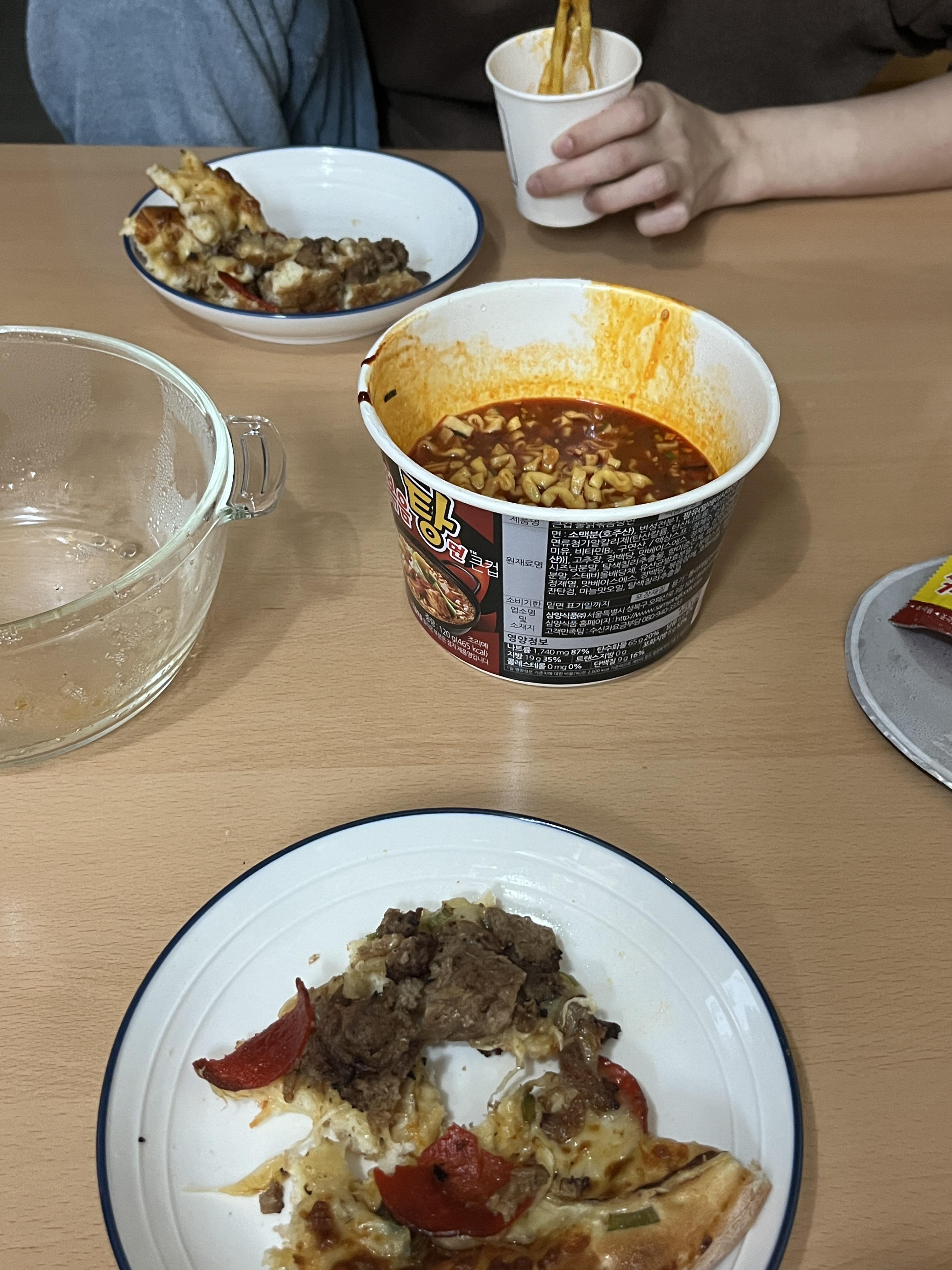 점심에 모닝빵으로 샌드위치 두개만들어먹고 너무 배고파서 과자남은거 두개 해치우고 (눈을감자, 라즈베리 빵모시기) 배고파서 결국 참깨라면 미니컵라면 먹었다,,,