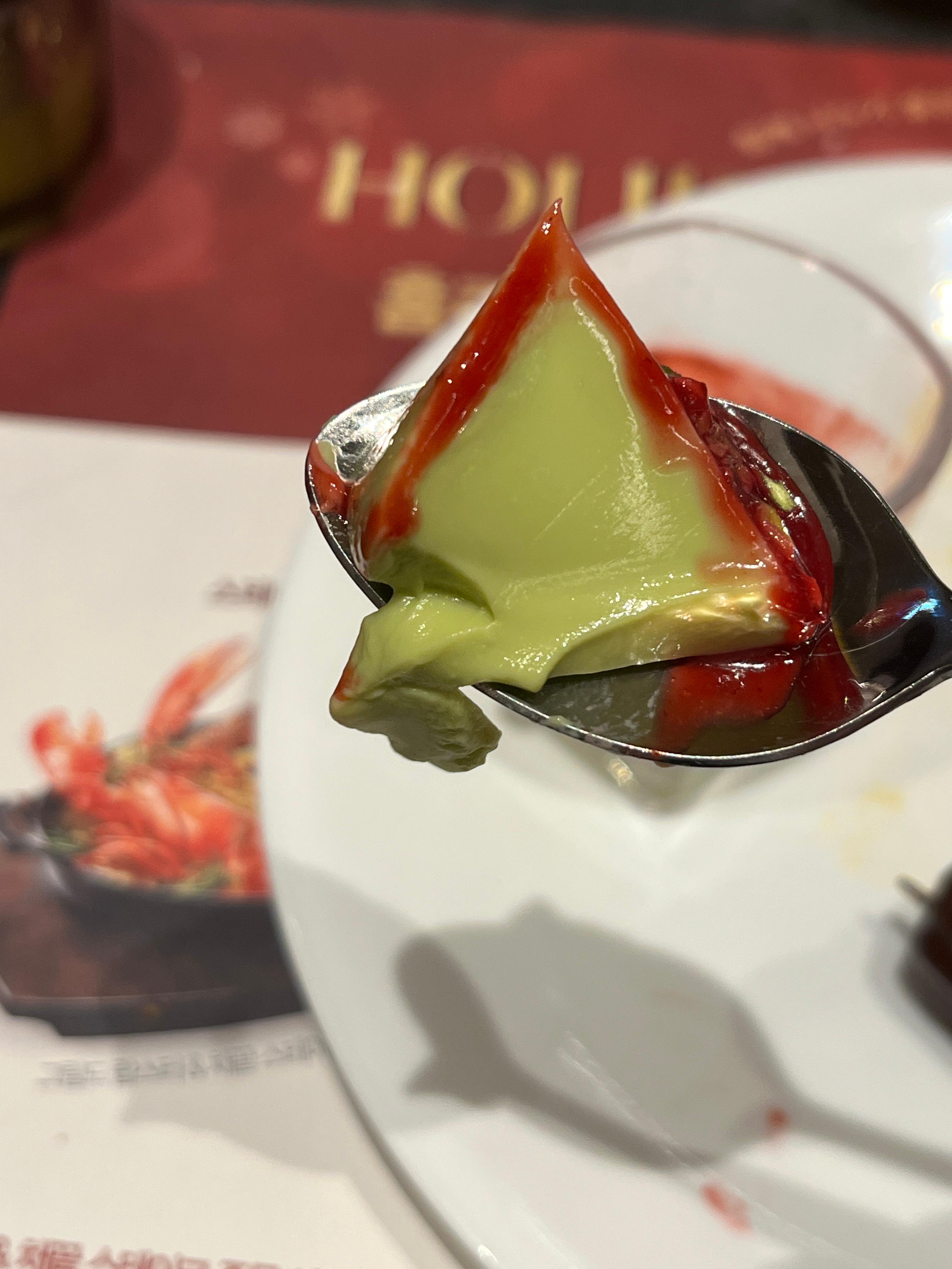 피스타치오 위에 라즈베리 소스올라간 푸딩!