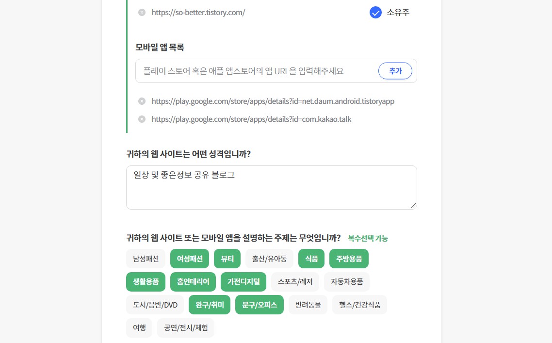 2-3. 모바일앱목록에 붙여넣어주기 (저는 카카오와 티스토리 둘다 넣어주었어요)