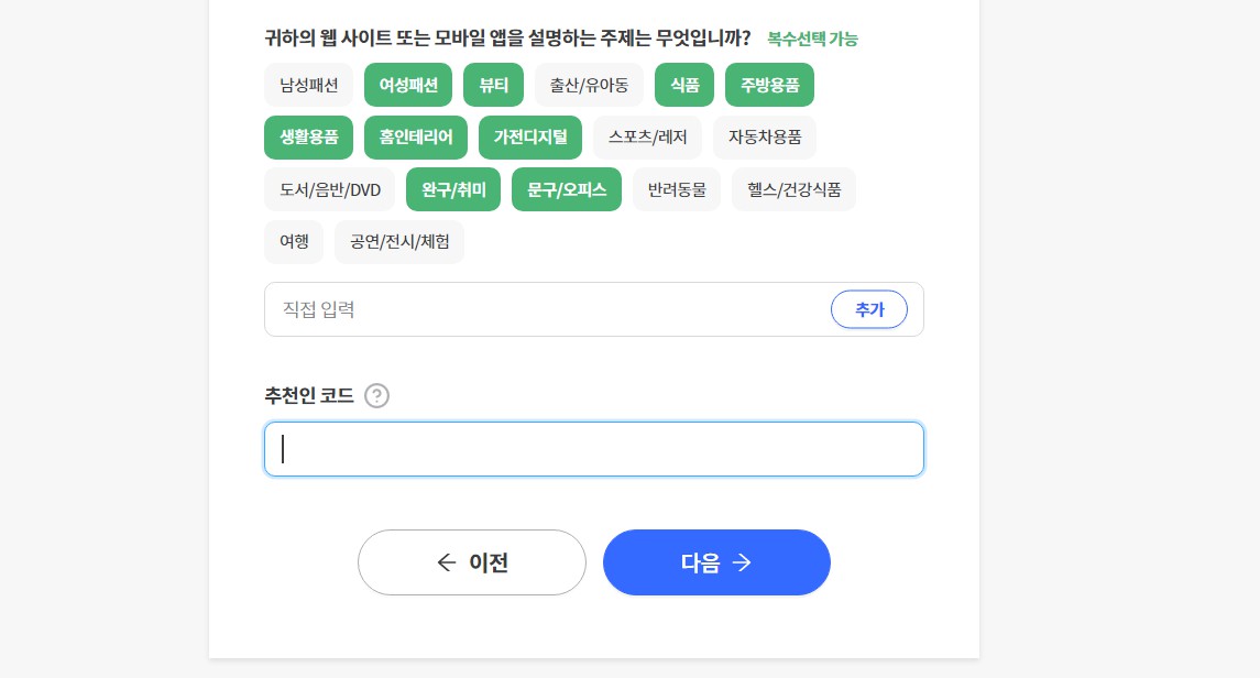 3. 주제 및 블로그소개 글을 작성해 주고 추천인코드를 꼭! 넣어줍니다.